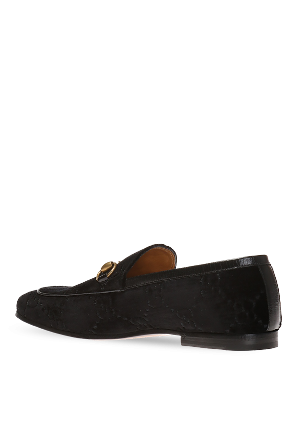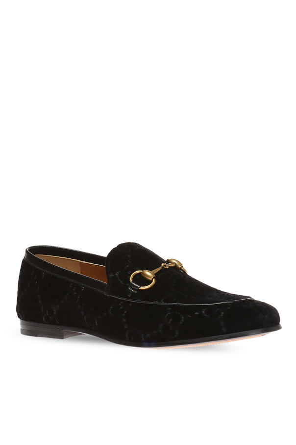 Black \'Jordaan\' velvet loafers from Gucci. Trimmed with black leather. Enriched by embroidered logo. Enriched by a signature antiqued gold-tone horsebit detail at front. Brown leather sole.