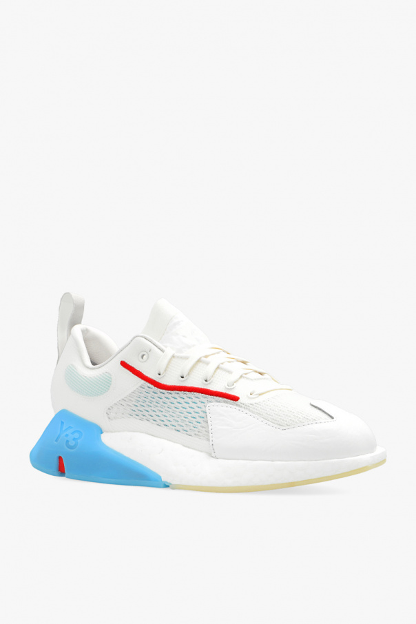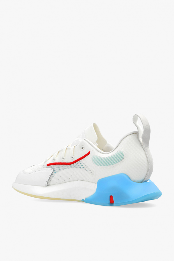 White and blue ‘Orisan’ sneakers from Y-3 Yohji Yamamoto. Crafted from transparent synthetic mesh, this lace-up model features suede and leather overlays, logo detailing on the tongue and side, red stitching on the sides, a BOOST midsole for superb cushioning and a multicoloured rubber outsole.