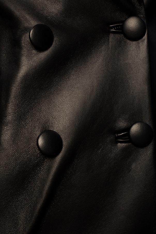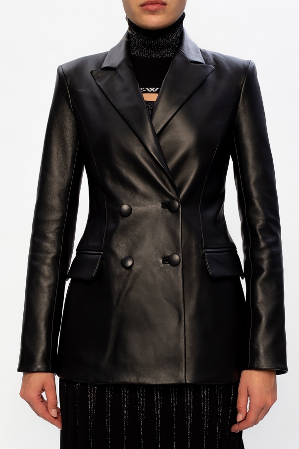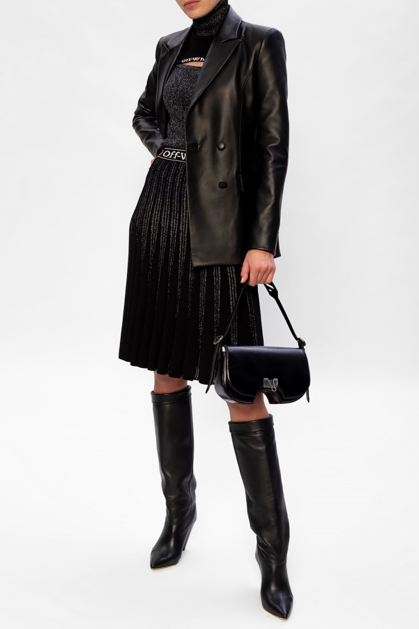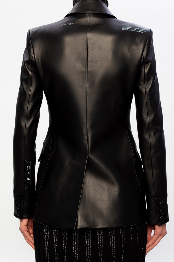 Black double-breasted blazer from Off-White. Crafted from leather, this garment features button fastenings, two flap pockets on the front, a white print at the back and padded shoulders.