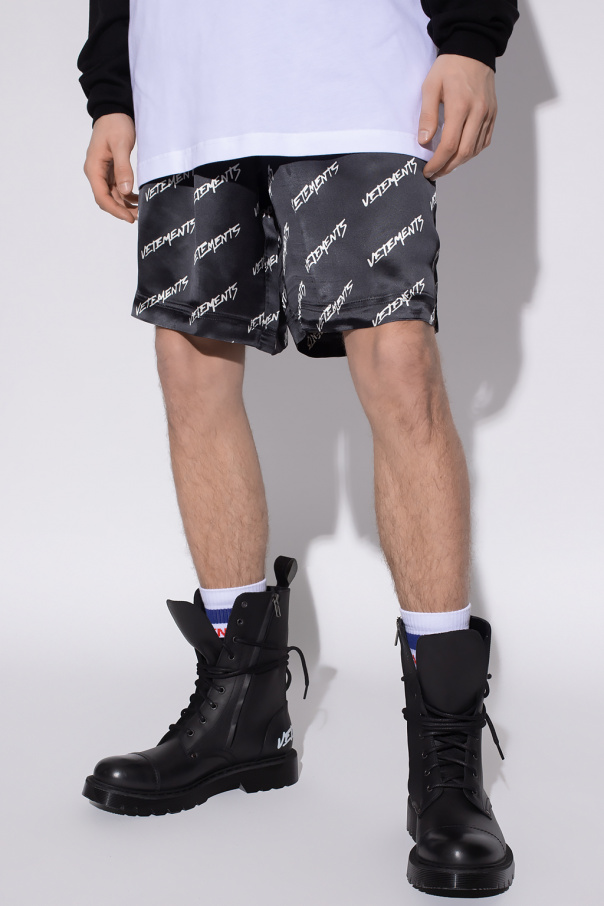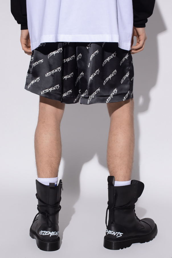 Black shorts from VETEMENTS. Printed with the brand\'s logo in white, this pair features a drawstring waist, two front slip pockets and side slits.