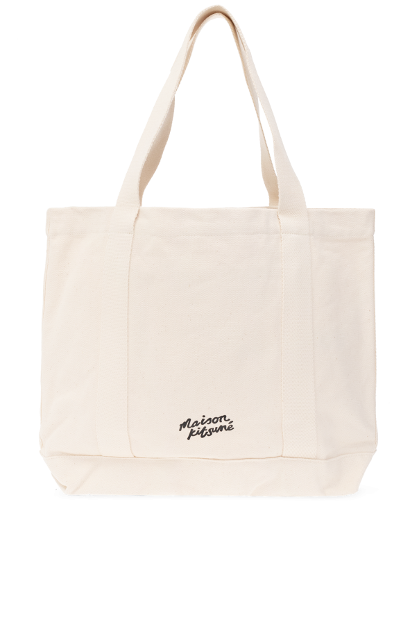 Cream shopper bag from Maison Kitsune. Crafted from cotton, this model features a brown, white and black printed logo pattern on the front, black logo at the back, two half-round handles and one internal compartment with one slip pocket.