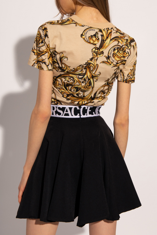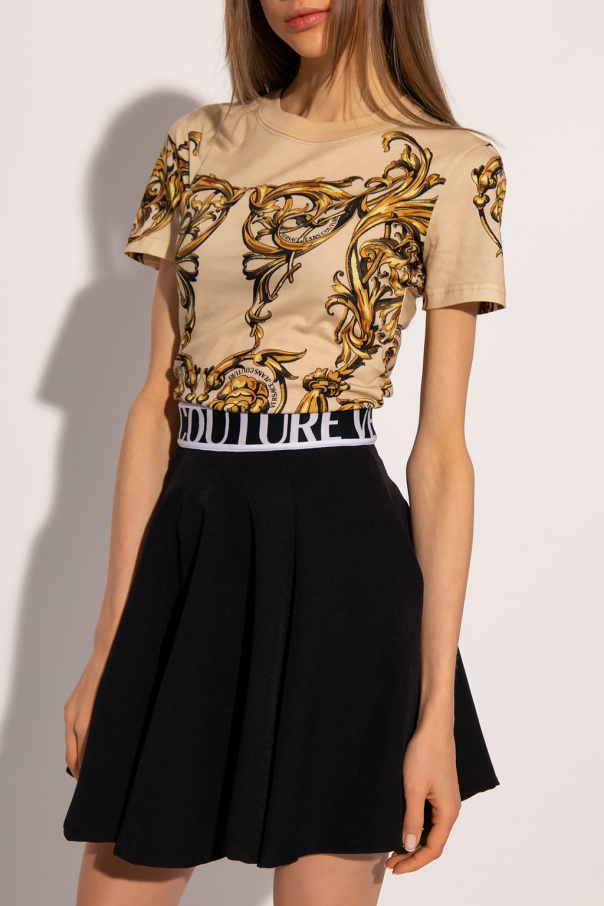 Beige crewneck T-shirt from Versace Jeans Couture. Crafted from cotton, this style features short sleeves, an elasticated collar and the brand\'s signature Barocco print.