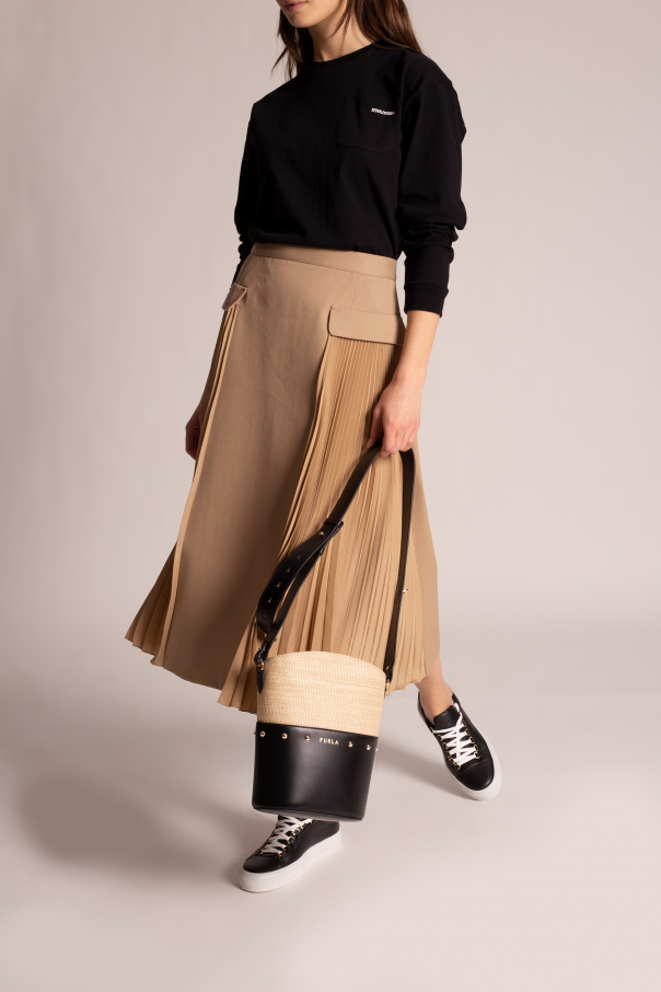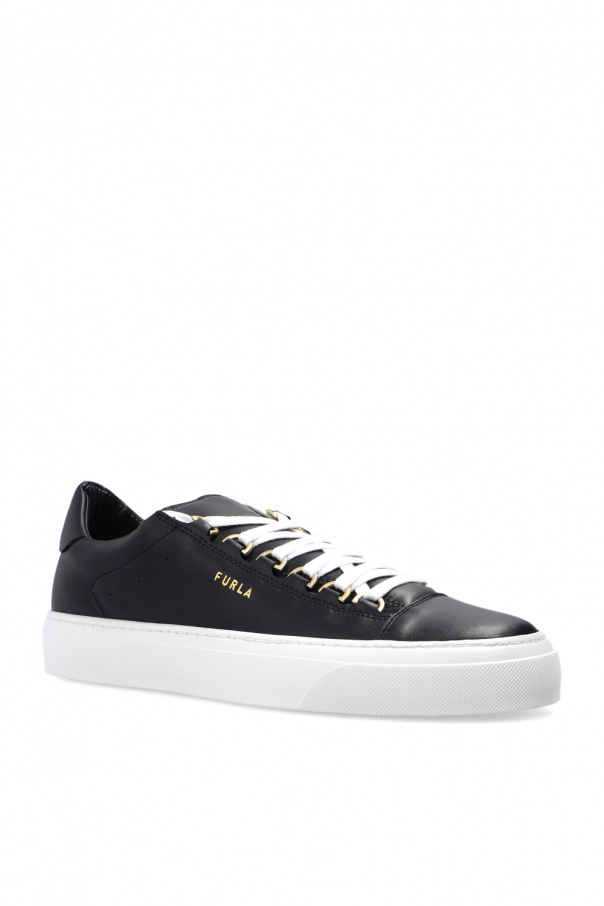 Black ‘Hikaia Low’ sneakers from Furla. Made of leather, this lace-up pair sits on a white rubber sole with an embossed logo and features a gold-tone logo print on the side.