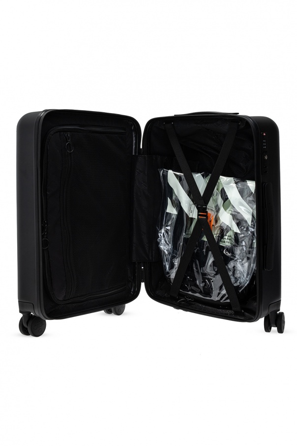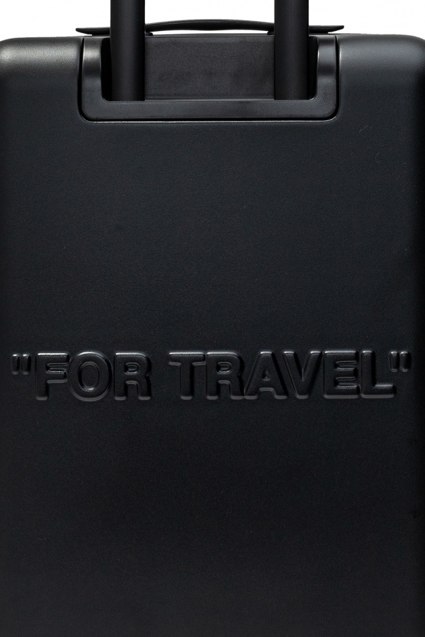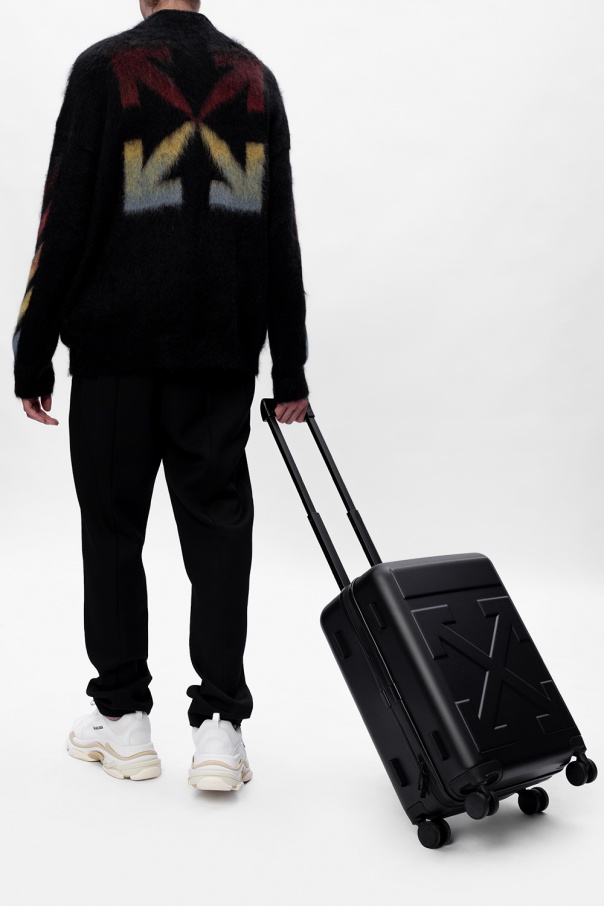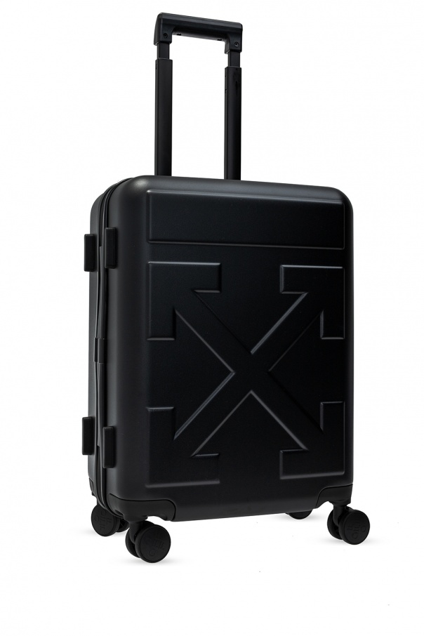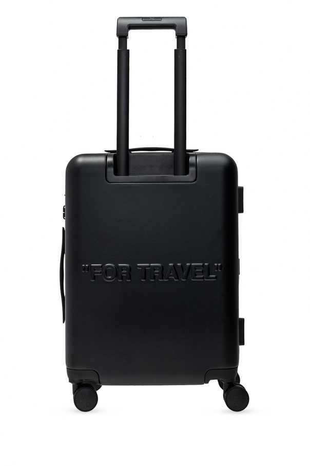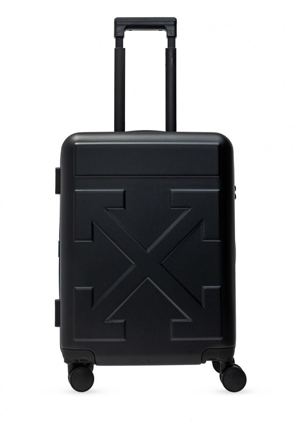 Black suitcase from Off-White. Designed for long travels, this sturdy valise is fastened with a combination lock and detailed with a raised logo, half-round handle, retractable telescopic handle, four rotating wheels as well as one internal compartment with three zip pockets inside. Zipped case included.