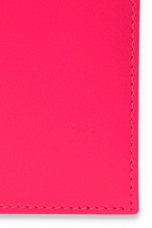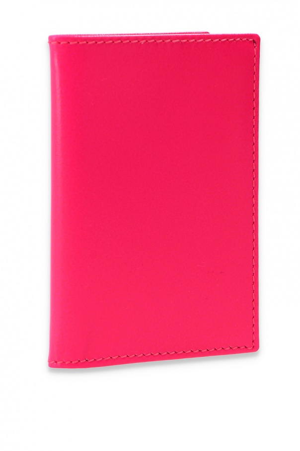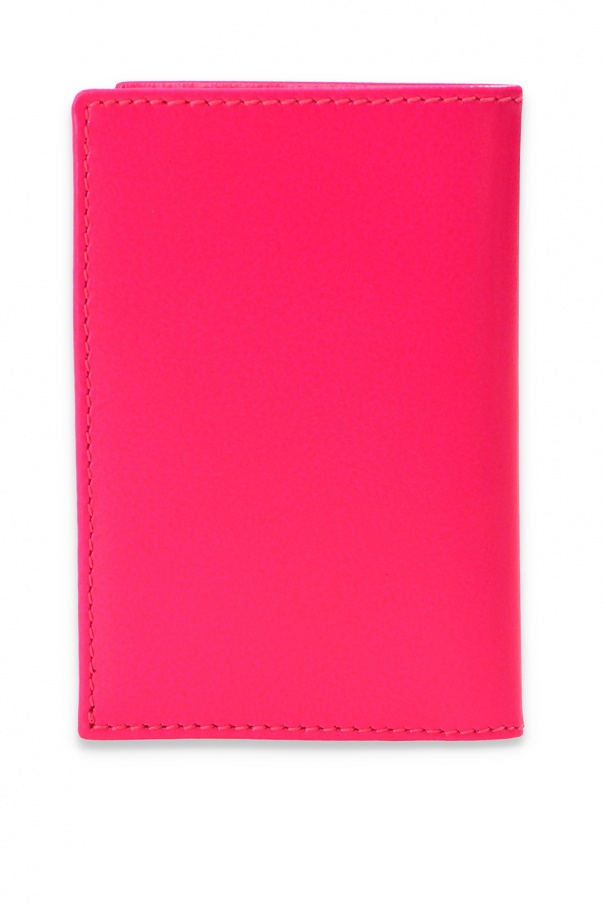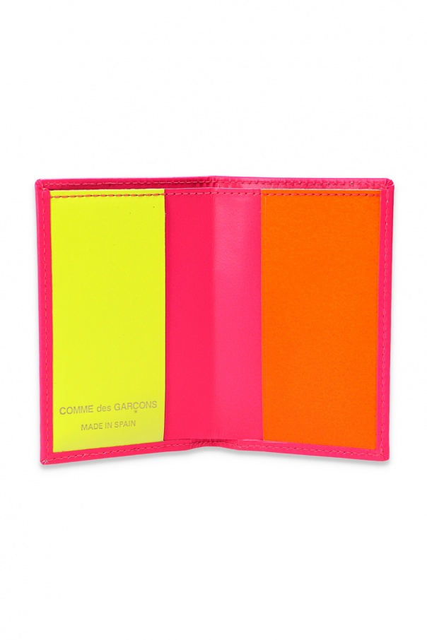 Neon pink bifold card holder from Comme des Garcons. Crafted from goat leather, this item features a neon orange and yellow lining decorated with an embossed logo in gold-tone and one internal compartment with two card slots.