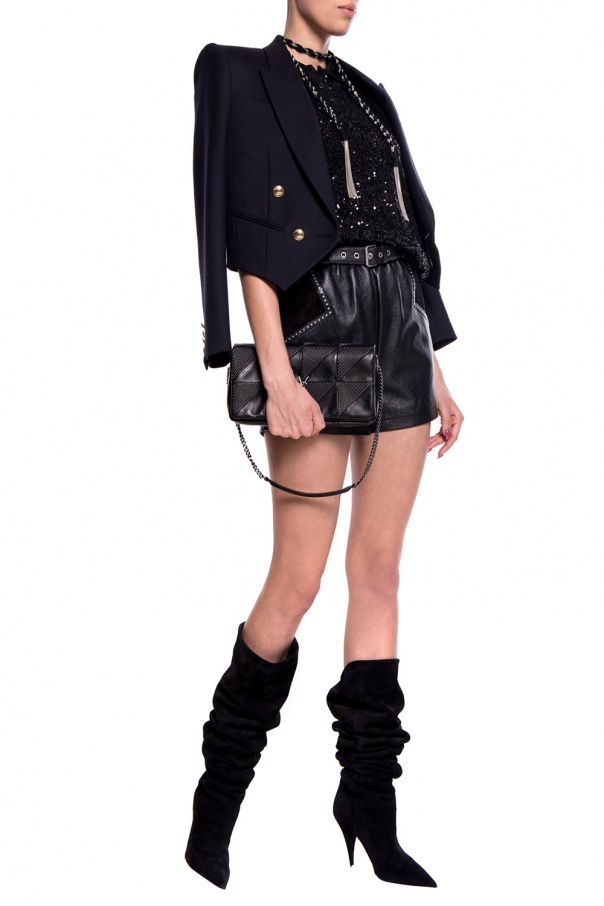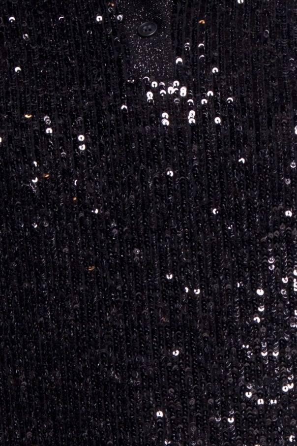 Black polo shirt from Saint Laurent. Collar trimmed with a metallic fiber. Fastened with 3 buttons at the neck. Decorated with black sequins.