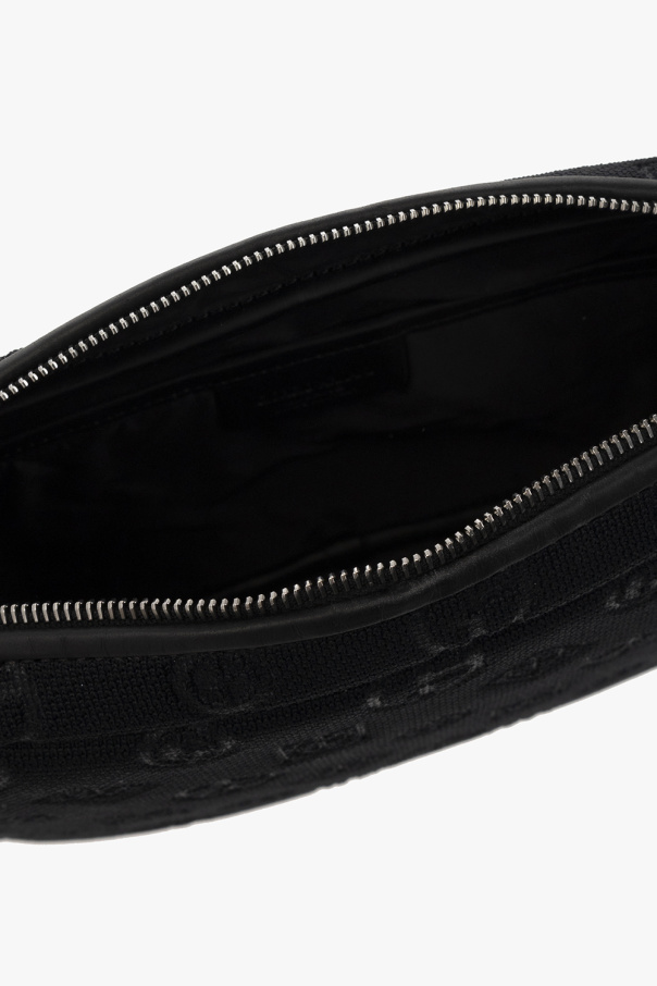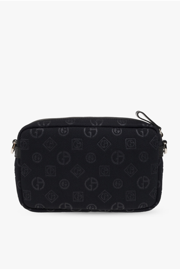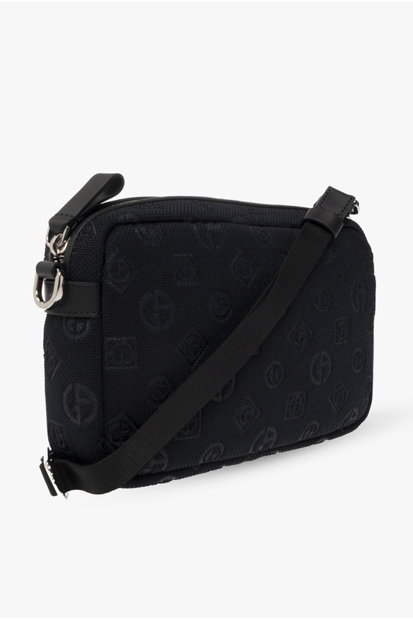 Navy and black shoulder bag from Giorgio Armani. Crafted from fabric with a jacquard monogram pattern with bovine leather, this model features a zip fastening, detachable and adjustable shoulder strap, silver-tone metal hardware and one internal compartment with two slip pockets.