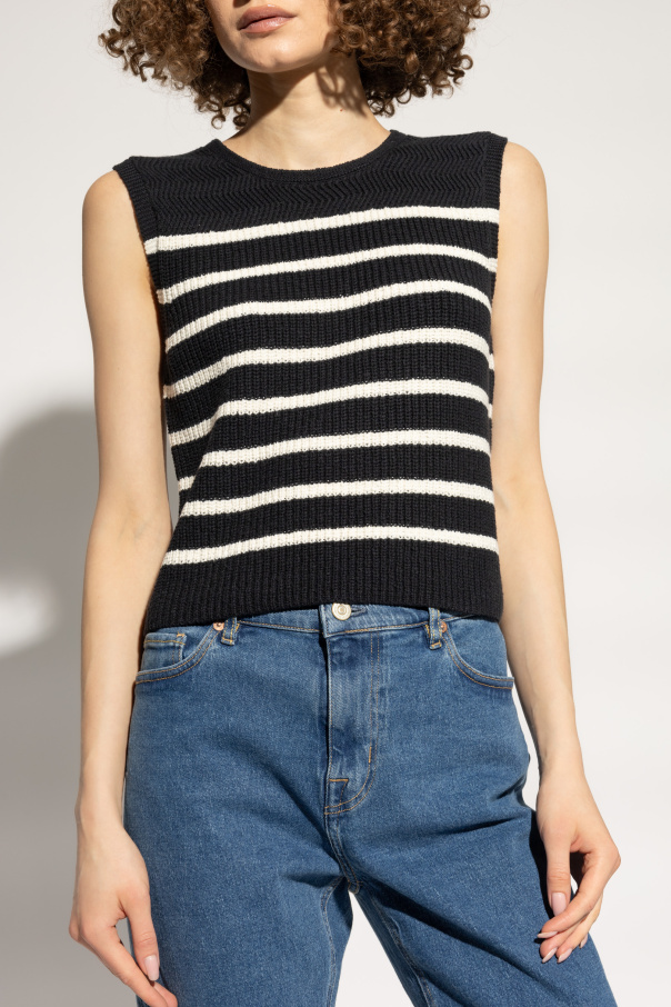 Introducing the \'Jen\' Vest by Rag & Bone, a manifestation of minimalist sophistication blended with the timeless appeal of the classic black and cream stripes. Crafted with a meticulous blend of 84% cotton and 16% nylon, this piece promises an exquisite balance of comfort and durability, tailored to complement the contours of your silhouette. The \'Jen\' vest features a sleek, sleeveless design, accentuated with a round neckline and a snug, non-zippered fit that seamlessly adapts to layering for diverse styling options. The distinctive knit texture, visible upon closer inspection, showcases rhythmic, intricate patterns that lend a tactile richness to the garment. Furthermore, the vest is meticulously finished with a broad, ribbed hem around the shoulders and neckline, injecting a dash of texture and character. Lacking visible branding, the \'Jen\' vest speaks volumes of Rag & Bone\'s subtle branding approach, likely bearing the mark of authenticity discreetly within, on an inner tag. This design choice underscores the vest\'s elegant simplicity and the brand\'s confidence in the quality and style of their garments. Why Purchase the \'Jen\' Vest? Timeless Aesthetic: The classic black and cream stripes offer versatile styling possibilities. Supreme Comfort: Crafted from a cotton and nylon blend, ensuring both softness and stretch for a perfect fit. Unique Texture: The distinctive knit pattern and ribbed finishes add depth and character to the vest. Layering Perfection: Sleeveless and snug-fitting, ideal for sophisticated, layered ensembles. Subtle Elegance: With no overt branding, its understated elegance makes a statement of refined taste.