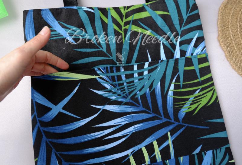 На передній частині є 2 кишені для еко мішечків, дрібниць. Всередині є кишенька для дрібниць, ручки з ремінної стропи.