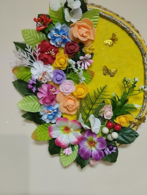 Панно виготовлене в єдиному екземплярі з декоративного шнура й об'ємних штучних квітів. Оригінальний елемент домашнього декору. Ідеально підходить для прикрашання вітальні, спальні або кухні. Розмір 25х 21см.