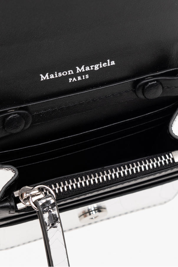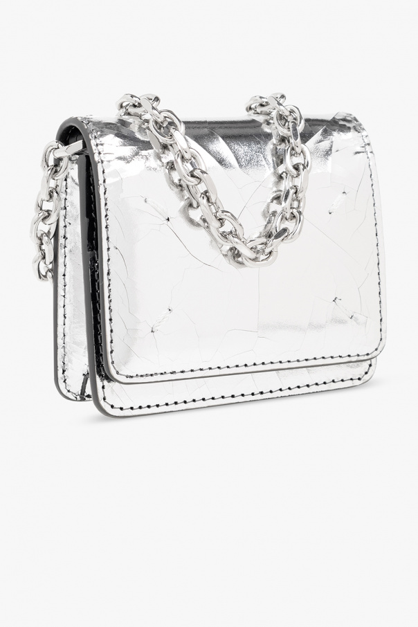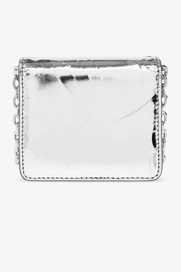 Silver-tone wallet from Maison Margiela. Crafted from calf leather with a cracked effect, this pair is complete with a magnetic snap, white logo embroidery, detachable silver-tone chain and one internal compartment with a zipped pocket and five card slots.