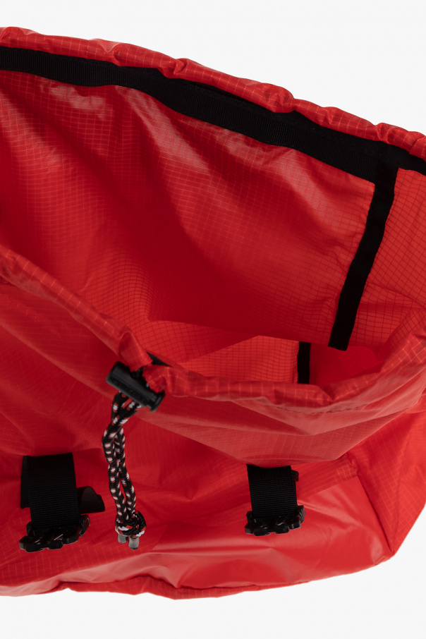 Red backpack from Hunter. Fastened with snaps, this design features a white, black and red logo print, two slip pockets, half-round handle and adjustable shoulder straps.
