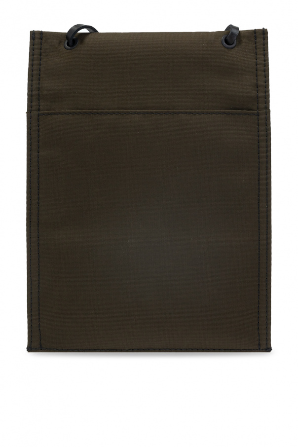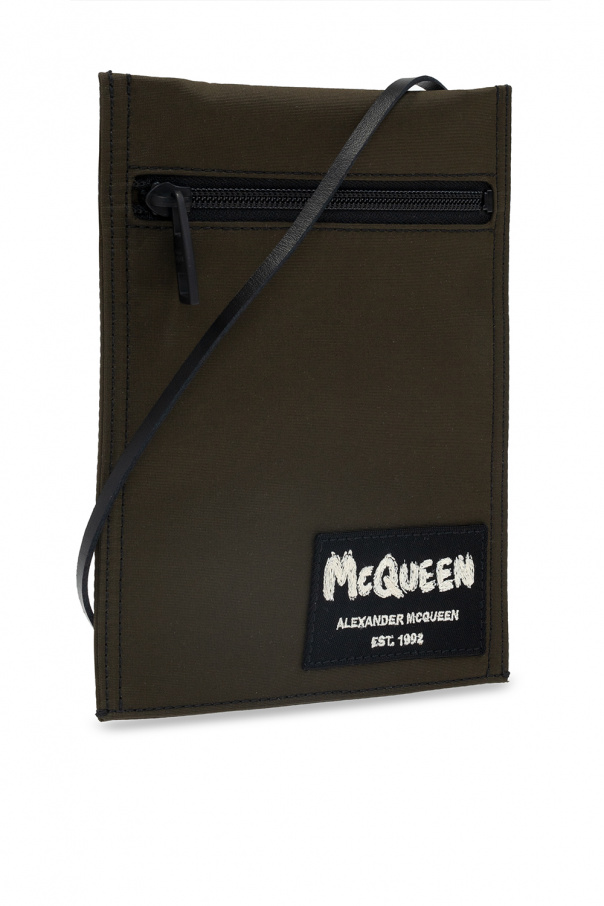 Dark green and black pouch on a strap from Alexander McQueen. Enriched by an appliqué with an embroidered cream logo on the front, this item features a zip fastening and a slip pocket at the back.