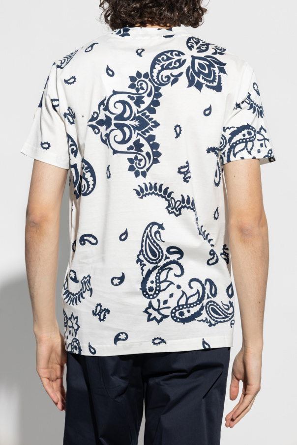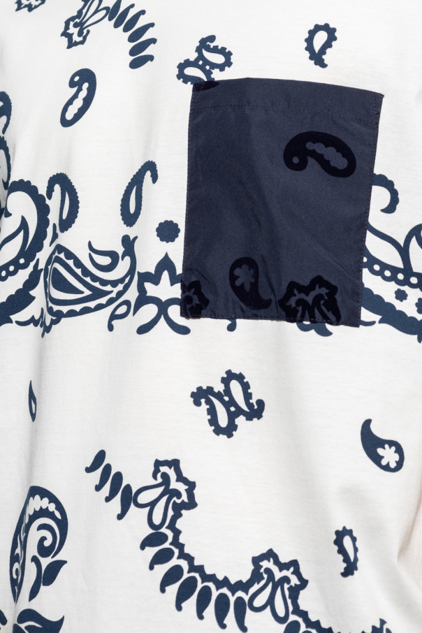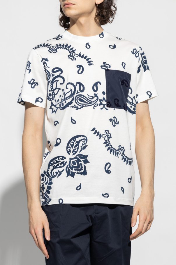 White crewneck T-shirt from Moncler. Crafted from cotton, this style features a navy blue graphic print, a navy blue chest pocket and short sleeves – one has a colourful logo patch.