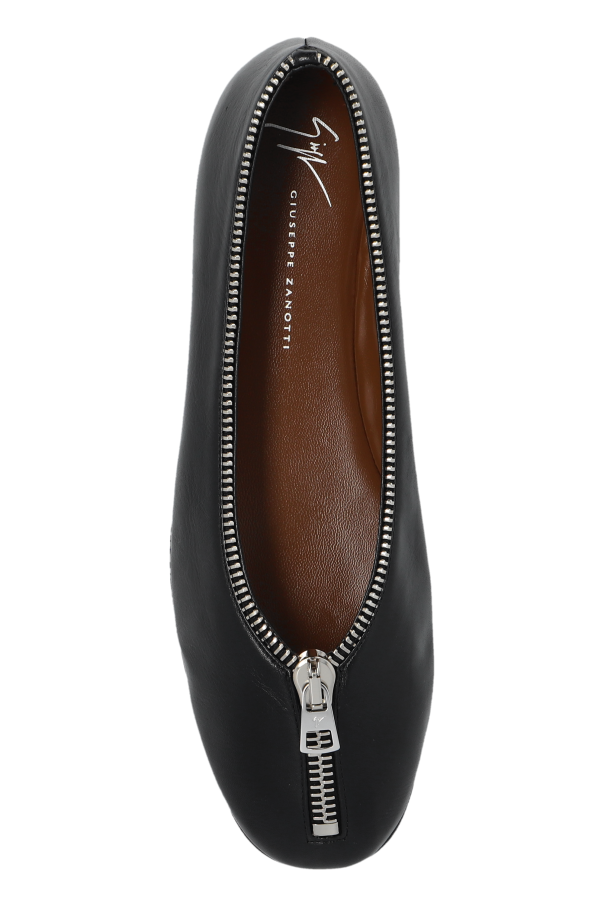 Introducing the sophisticated Amanda Ballerinas from the exclusive collection by renowned designer Giuseppe Zanotti. These exquisite ballerinas are crafted from sleek, black leather, exuding elegance and durability. The classic, rounded shape with a subtly elevated toe ensures a timeless appeal, while the decorative zipper along the edges adds a touch of modernity. The front of the shoe features a functional yet stylish zipper, enhancing both aesthetics and convenience. Inside, the ballerinas are lined with soft material for unparalleled comfort, and the designer\'s logo is prominently displayed, marking their exclusive pedigree. The flat sole ensures all-day wearability, making them a perfect blend of style and comfort. Why Choose This Product? Crafted from premium black leather for an elegant look and exceptional durability Features a classic rounded shape with a modern decorative zipper Functional front zipper adds a unique aesthetic and ease of use Soft inner lining for maximum comfort Flat sole for all-day wearability Exclusive designer logo inside