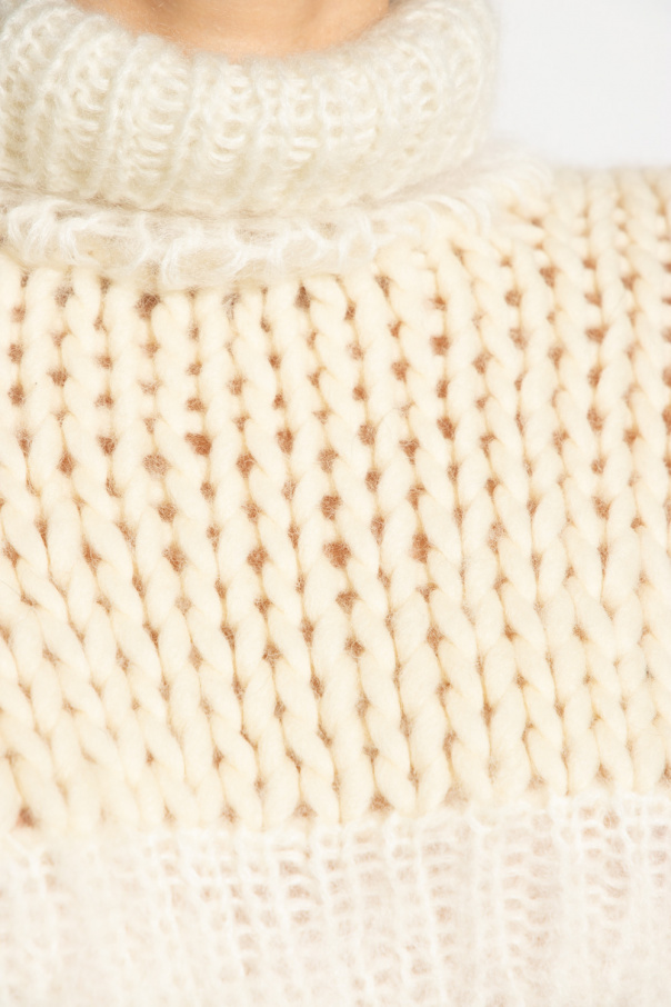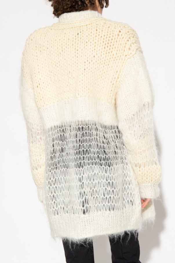 Cream cardigan from Undercover. Crafted from a wool and mohair blend, this long sleeve design features button fastenings, decorative knits and ribbed trims at the V-neck, hem and cuffs.