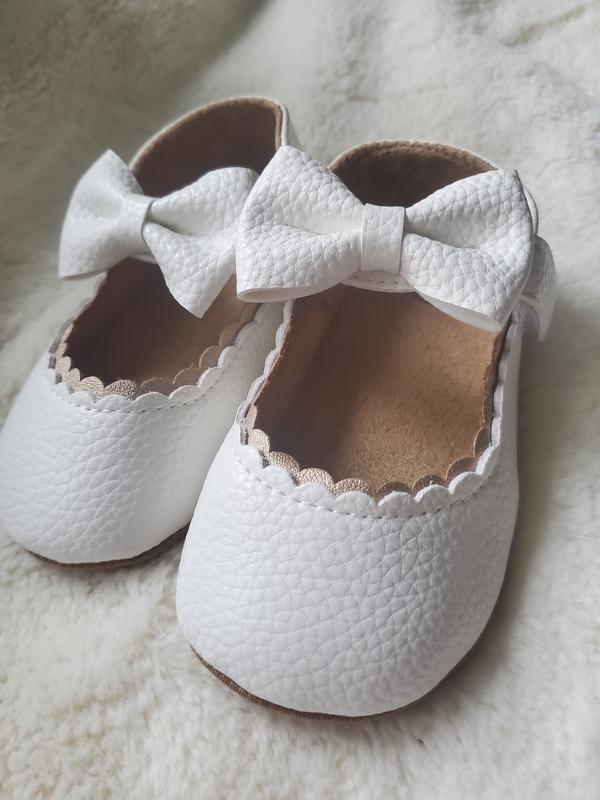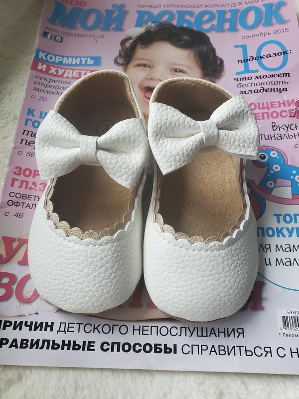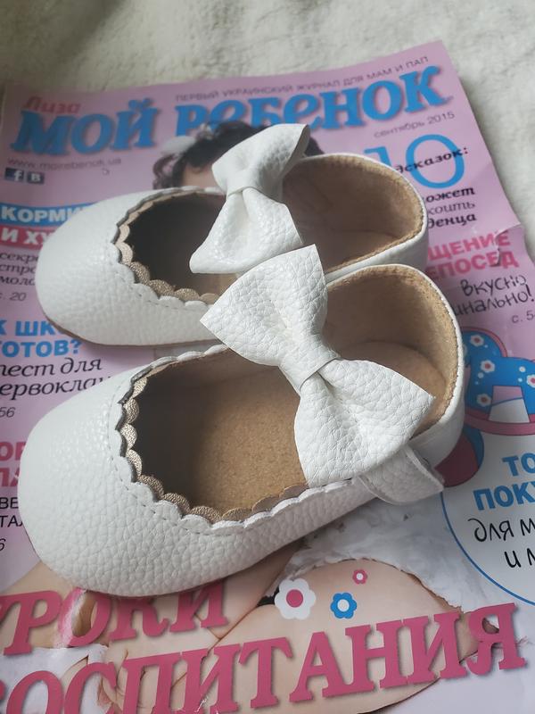 Продам великолепные туфельки пинеточки белые, очень красивые качественные, с полностью резиновой подошвой, мягко по улице бегать, бантик застежка на липучке.