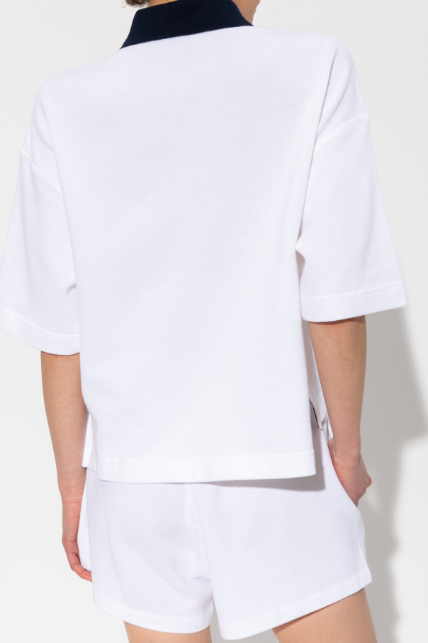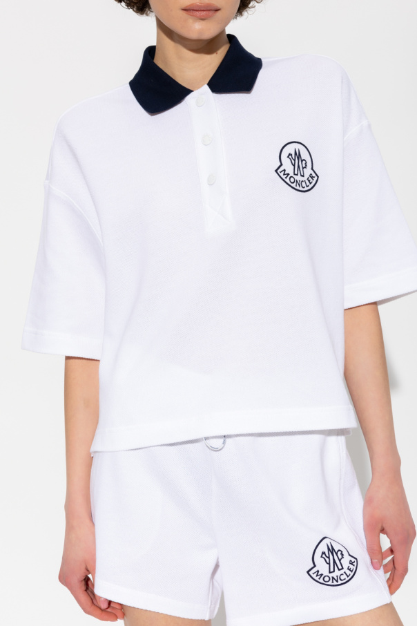 White polo shirt from Moncler. Made of cotton. Fastened with snap buttons, this short sleeve design features a logo embroidery and collar in navy.