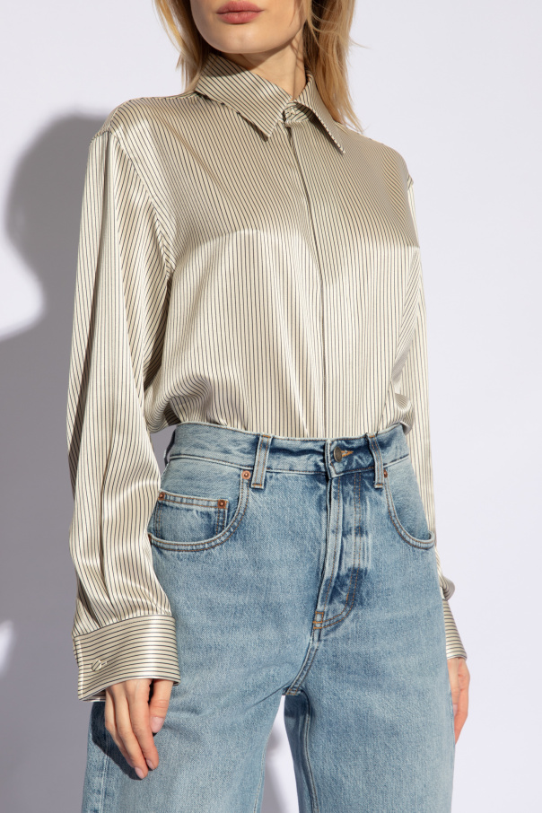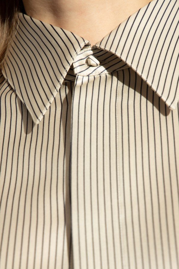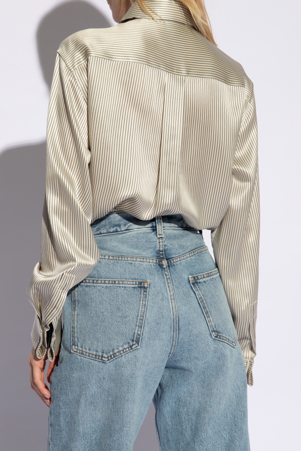 Cream and navy blue shirt from Saint Laurent. Made from silk, this style fastens via buttons with a concealed placket and showcases a pinstripe pattern and long sleeves with buttoned French cuffs.