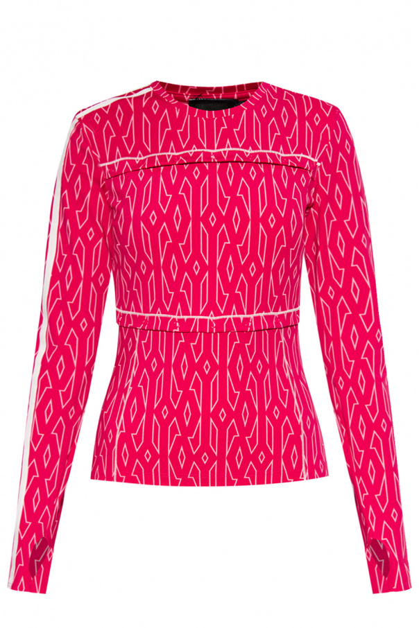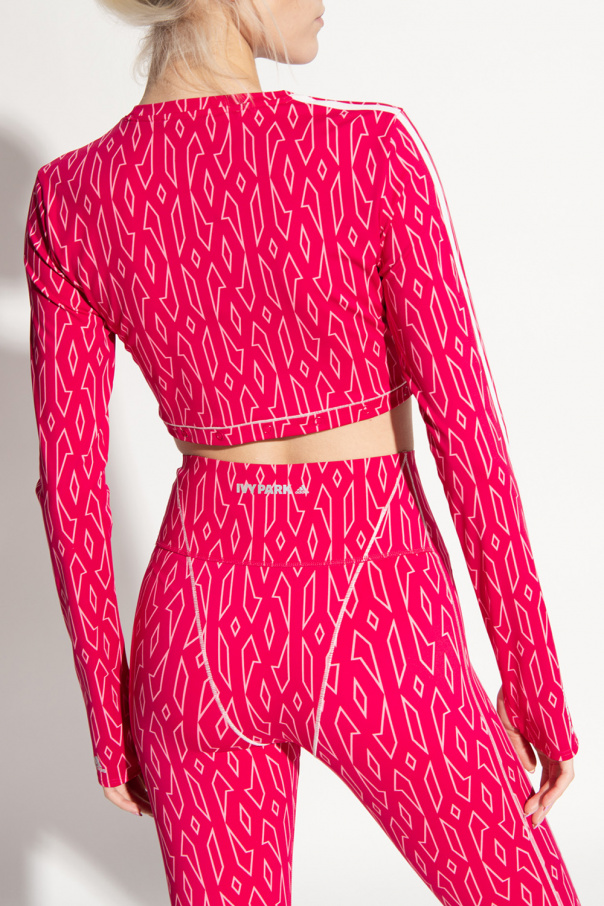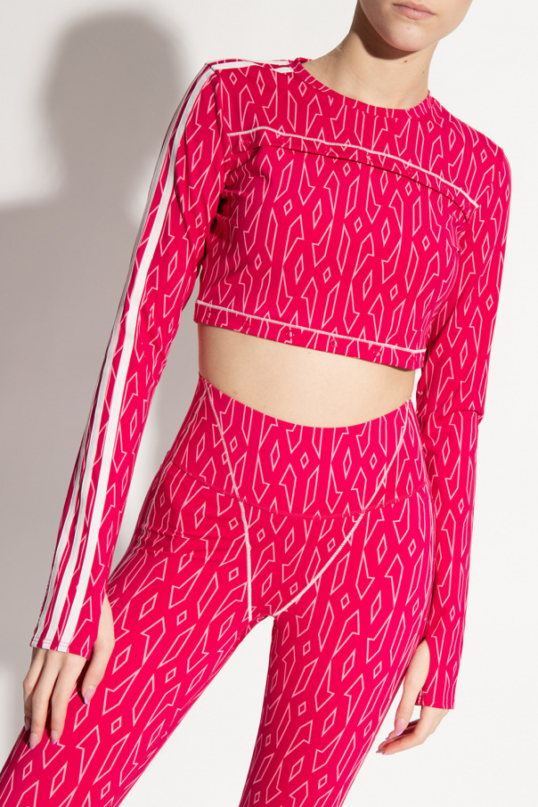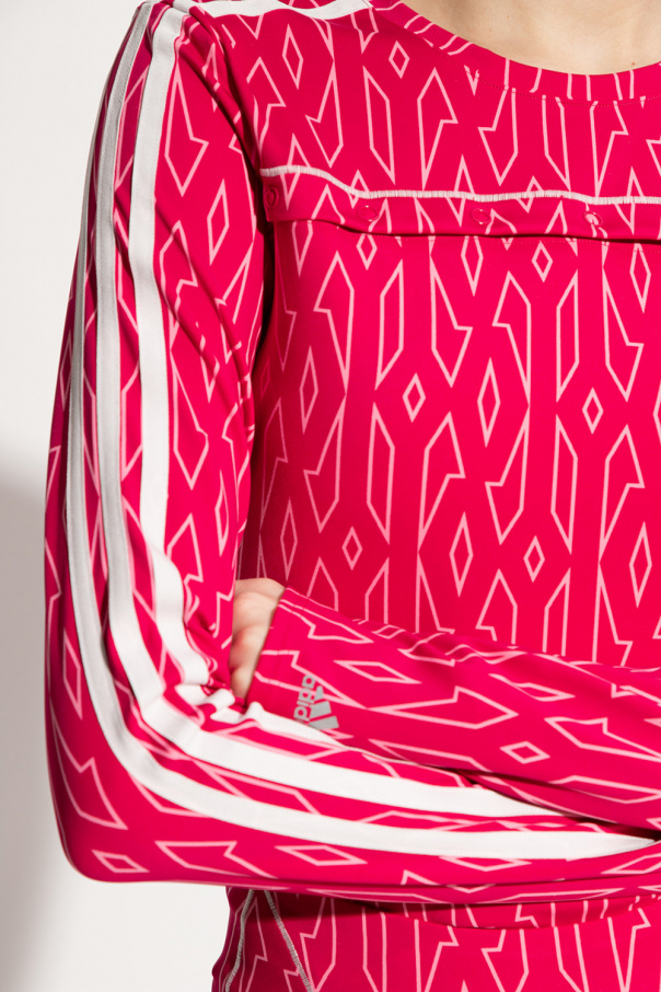Dark pink sports top from ADIDAS Originals x Ivy Park. This round neck design features a printed pattern, decorative stitching details, long sleeves with the iconic three stripes in white down the sleeves and thumb holes as well as a detachable bottom part.