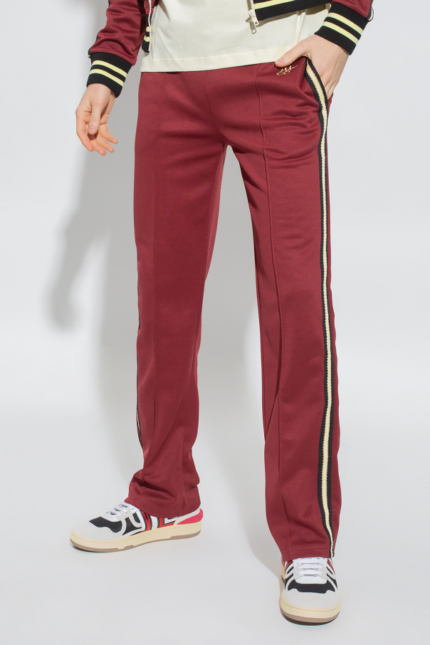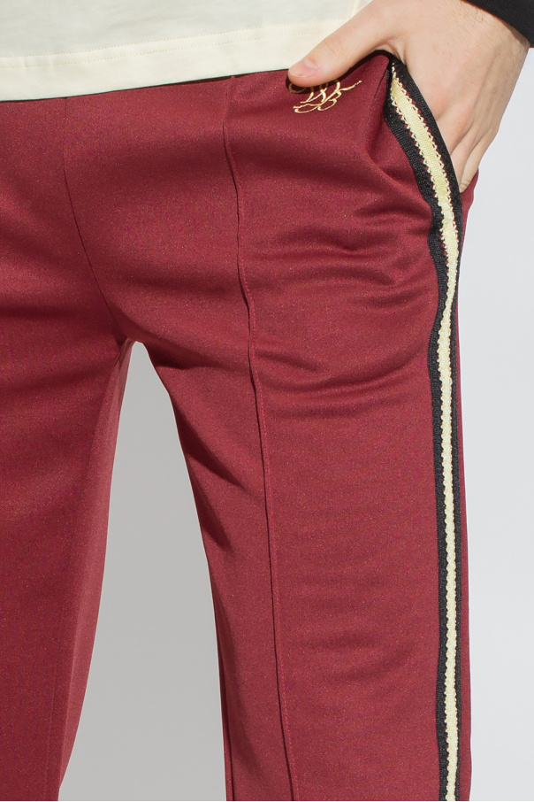Maroon ‘Studio’ sweatpants from Wales Bonner. Fastened with drawstrings, this pair features an elastic waistband, light yellow logo embroidery, light yellow and black side stripes, four slip pockets and straight legs.