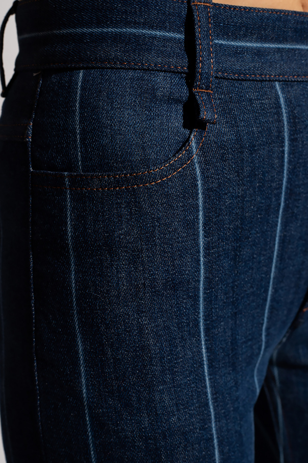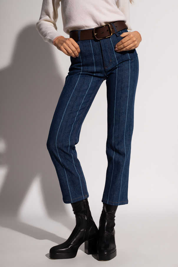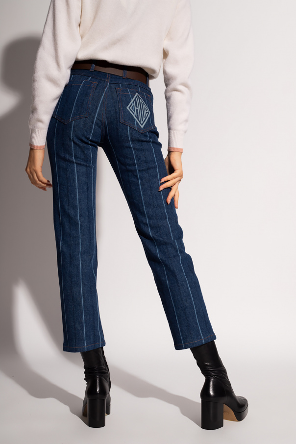 Blue jeans from Chloé. Fastened with a zip and button, this pair falls down with slightly tapered legs and is complete with light blue pinstripes, two front pockets and two back pockets with a logo print.