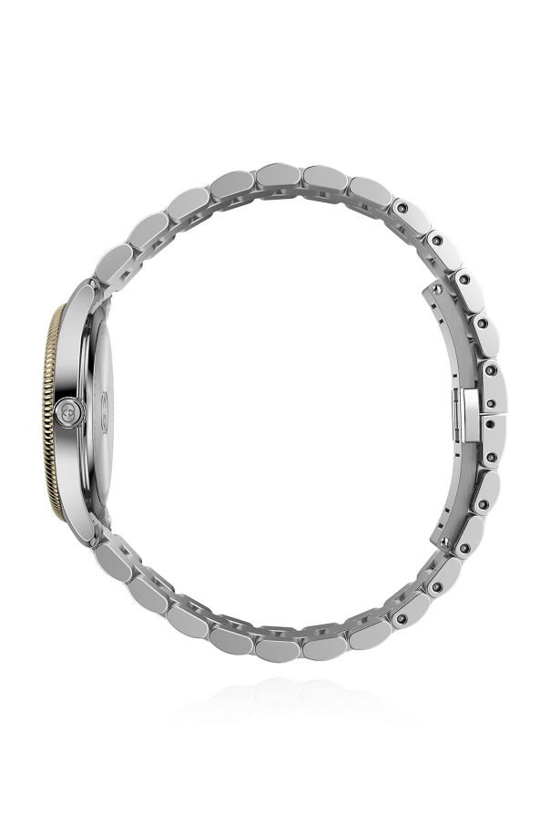 Introducing the pinnacle of timeless elegance and modern sophistication - the \'G-Timeless\' watch by the illustrious Gucci. Crafted with meticulous attention to detail, this exquisite timepiece is a testament to Gucci\'s commitment to luxury and excellence. The watch boasts a stunning silver dial with a delicate sunray finish, complemented by golden accents that add a touch of opulence. Central to the dial, the iconic Gucci logo sits proudly, surrounded by golden hour markers and hands, ensuring readability is as refined as its aesthetic. Encased within a gold-plated bezel, the watch exudes sophistication, while the silver metal bracelet with its classic flat links promises comfort and a seamless fit. Noteworthy is the watch\'s butterfly clasp, designed for ease of use and security. The reverse of the timepiece reveals a smooth, metal finish engraved with the Gucci logo - a hallmark of quality and authenticity. Produced in the esteemed Swiss Kering manufacture, the \'G-Timeless\' model features a 29mm case diameter and a white, pearl-like dial that houses the subtle \'Interlocking G\' motif on one of its hands. A sapphire glass with anti-reflective coating ensures durability and clarity, making this watch not only a statement of luxury but also a masterpiece of Swiss craftsmanship. Why Purchase This Product? Exquisite Craftsmanship: Swiss-made precision, embodying Gucci\'s heritage of luxury. Elegant Design: Silver and gold palette conveys sophistication, with a sunray-finished dial and gold-plated bezel. Comfort and Convenience: Flat link bracelet and butterfly clasp offer a snug fit and ease of use. Distinctive Features: Pearl-like dial with \'Interlocking G\' detail, anti-reflective sapphire glass.