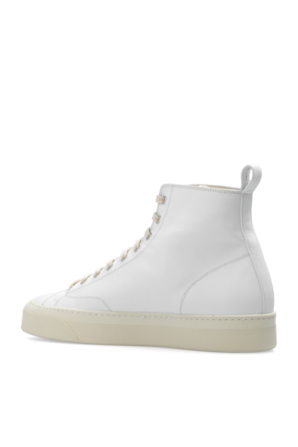 White ‘Tournament High’ sneakers from Common Projects. Crafted from leather, this lace-up pair features a gold-tone series stamp and cream rubber sole.