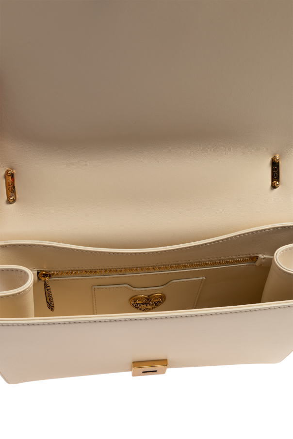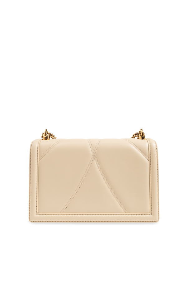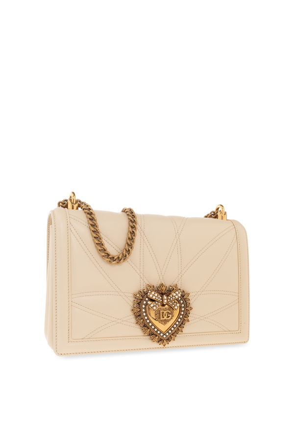 Cream ‘Devotion Large’ shoulder bag with a gradient effect from Dolce & Gabbana. Made of lamb leather with distinctive quilting, this design features a chain and leather shoulder strap, antiqued gold-tone metal hardware as well as one slip pocket and one compartment with one zip pocket and one card slot inside.