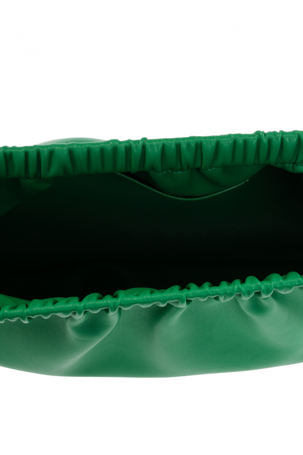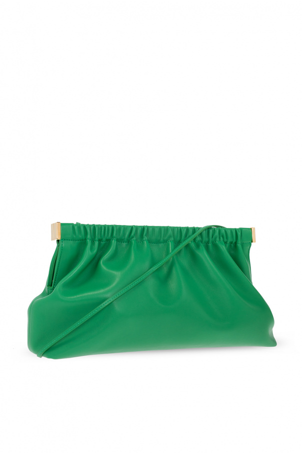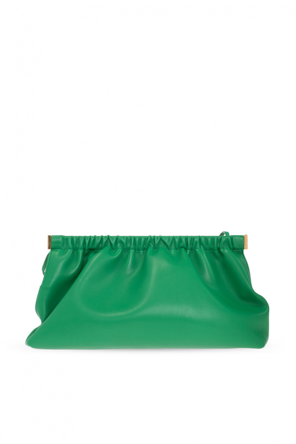 Green ‘The Bar’ clutch from Nanushka. Made of vegan leather, this model features a magnetic closure, gathers, detachable shoulder strap, gold-tone metal hardware and one internal compartment with one slip pocket.