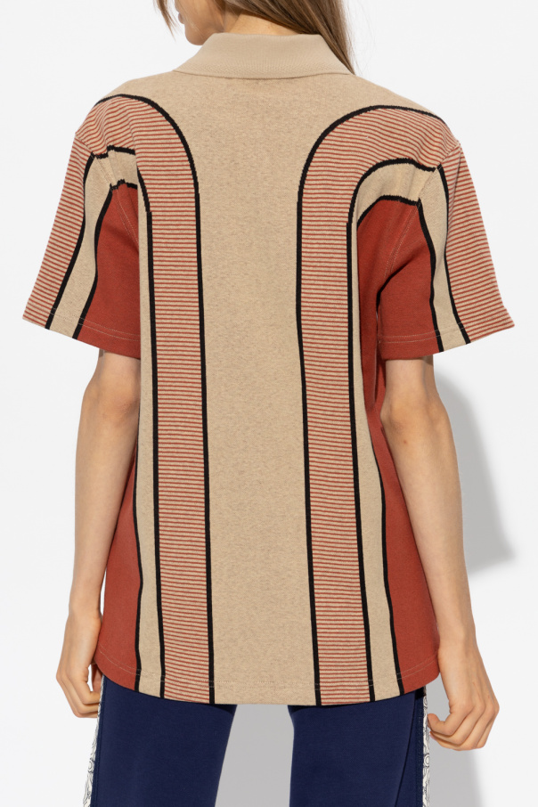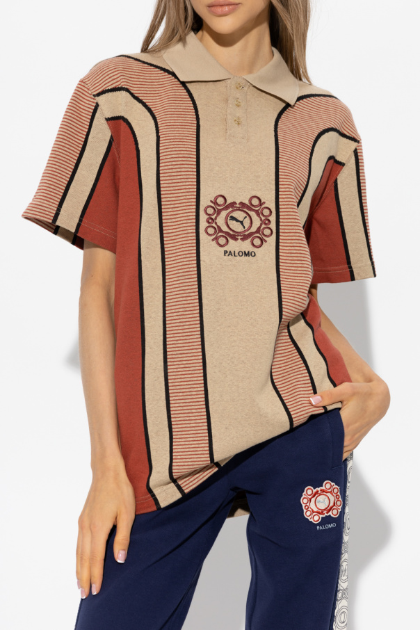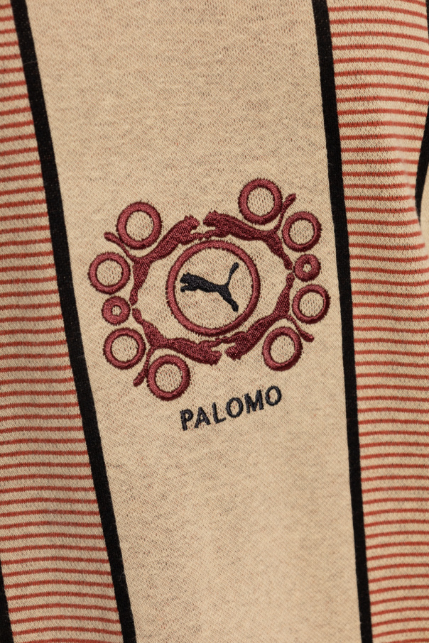 Beige, red and black turtleneck sweater from PUMA x Palomo Spain. Made of at least 20% recycled cotton, this short sleeve design features buttons, logo embroidery and stripe pattern. The PUMA x Palomo collection tells the story of ‘a sports icon in the ideal world’. Lifting inspiration from the signature styles of the ‘70s, it focuses on a ‘70s-inspired palette and big graphic design details. Premium, genderless apparel and sneakers represent the fluidity of the modern day while referencing the best styles of sporting history.