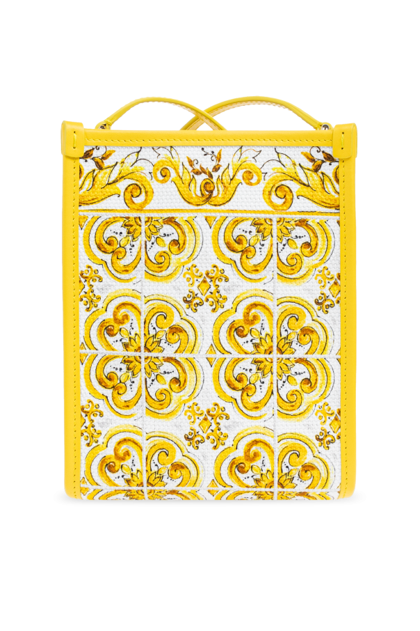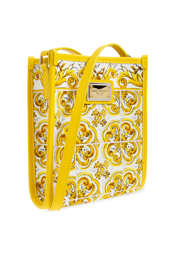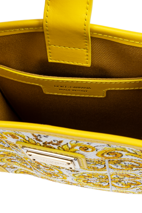Introducing the Dolce & Gabbana Majolica Shoulder Bag, a masterpiece of Italian craftsmanship that embodies the essence of luxury and artistic heritage. Fashioned from the finest leather and canvas materials, this exquisite accessory showcases the vibrant and intricate Majolica print, inspired by the renowned Italian ceramics. The rectangular silhouette is accentuated by bold yellow edges, creating a striking contrast against the elaborate patterns of florals and ornamental designs in hues of yellow and white set against a backdrop. The bag\'s design is further enhanced by a long, adjustable strap, offering versatile wearing options that complement any ensemble. A metallic plaque bearing the designer\'s name adorns the front panel, while the consistency of the Majolica pattern on both sides of the bag exemplifies attention to detail and design coherence. The interior, lined in a rich dark yellow or brown hue, features a sleek compartment and a slip pocket, each bearing the designer\'s logo and the prestigious \"Made in Italy\" mark, underscoring the bag\'s authenticity and superior quality. Secured with a magnetic snap closure, this shoulder bag not only stands as a symbol of fashion but also as a testament to the enduring allure of Italian elegance. Why Purchase This Product? Exclusive Design: Features the iconic Majolica print, celebrating Italian ceramic artistry. Premium Materials: Crafted from high-quality leather and canvas for durability and style. Versatility: Adjustable strap allows for multiple wearing styles. Attention to Detail: Consistent design and metallic designer plaque showcase meticulous craftsmanship. Authenticity: \"Made in Italy\" mark and designer logos as a testament to genuine quality and heritage.