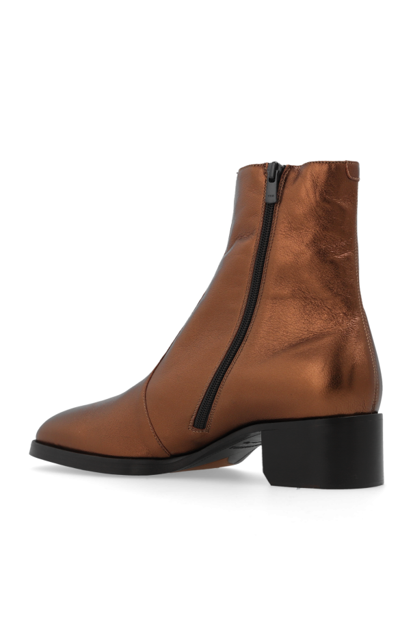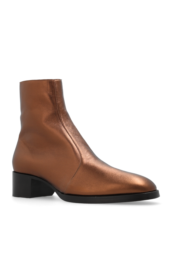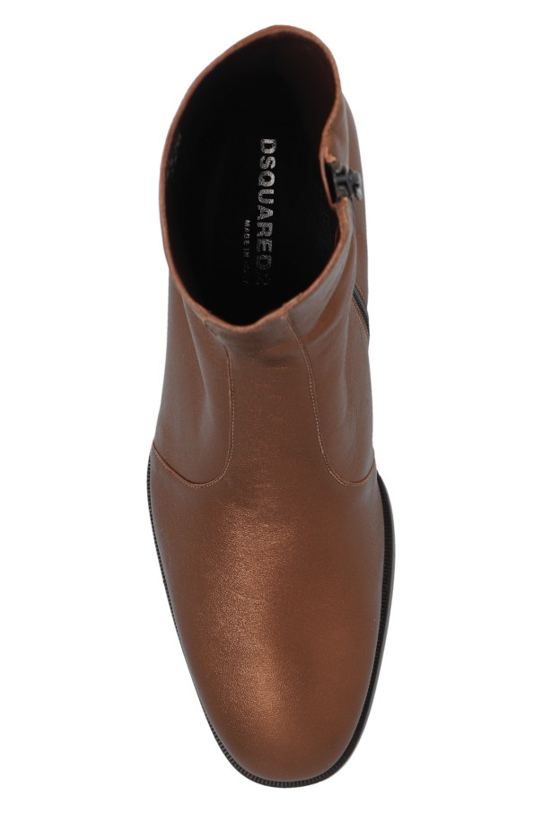 Brown ‘Vintage’ heeled ankle boots from Dsquared2. Crafted from leather with a metallic finish, this model sits on a brown and black leather sole with a rubber trim and features a side zipper and round toe.