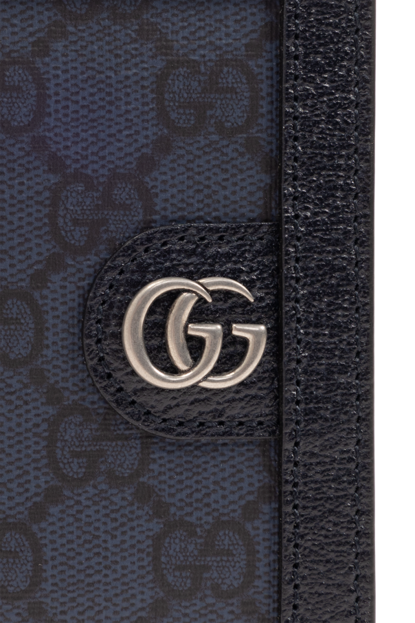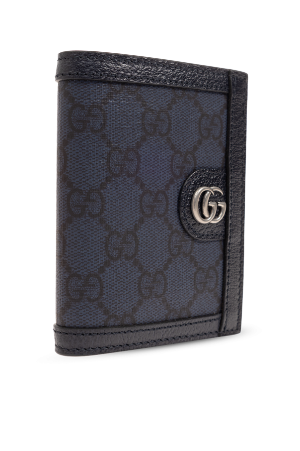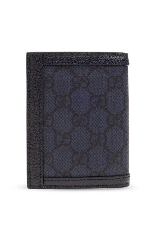Navy blue folding wallet from Gucci. Made of ‘GG Supreme’ canvas and leather, this item is embellished with a silver-tone metal logo plaque on the front and features one bill compartment, two slip pockets and six card slots inside.
