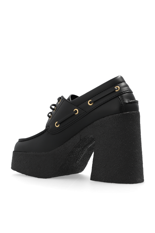 Black platform shoes from Stella McCartney. Crafted from vegan leather, this lace-up model sits on a black rubber sole and showcases an embossed logo on the front, decorative stitching details and gold-tone metal hardware.
