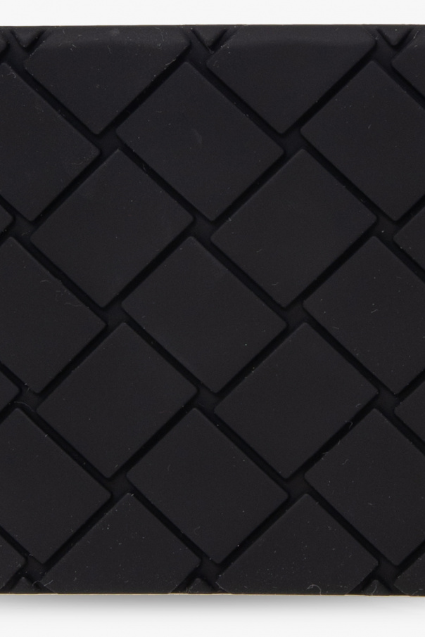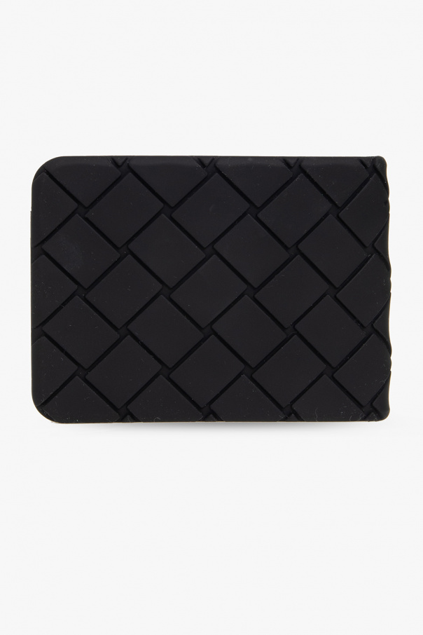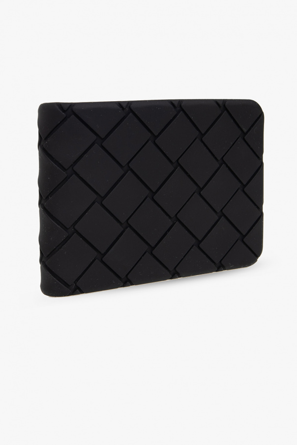 Black folding wallet from Bottega Veneta. Made from silicone, this design showcases the brand\'s iconic Intreccio weave. It is complete with two slip pockets and two card slots inside.