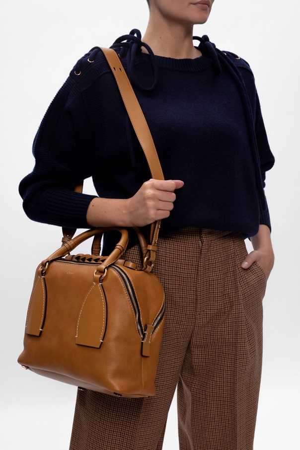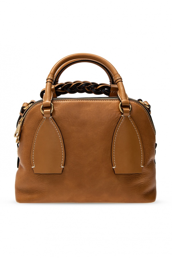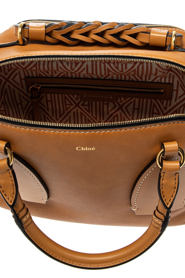 Light brown ‘Daria’ shoulder bag from Chloé. Crafted from leather, this style was designed with two separate zipped compartments. It also features the label\'s logo embossed in gold-tone on the front, three half-round handles (one is braided), a detachable and adjustable shoulder strap, gold-tone metal hardware and interior with one compartment and one zip pocket.