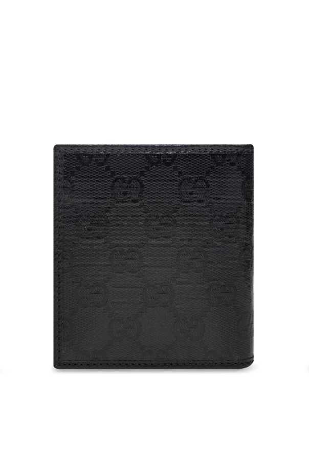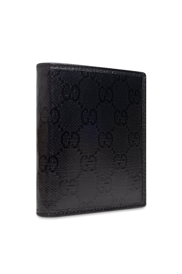 Black folding wallet from Gucci. Made of glossy ‘GG Crystal’ canvas and leather, this item is decorated with a monogram pattern and has two bill compartments, two slip pockets and six card slots inside.