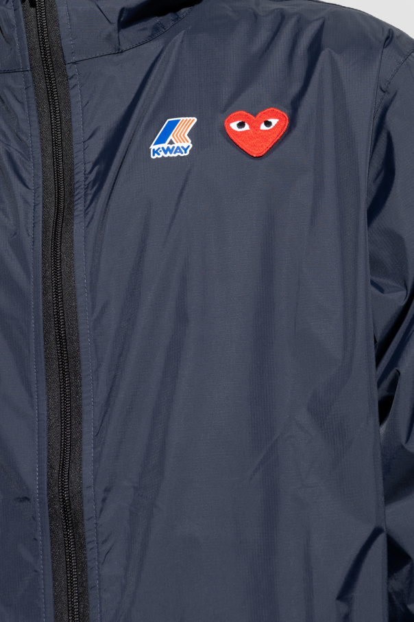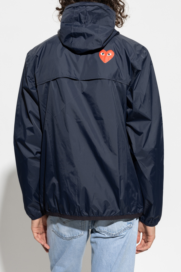 Navy rain jacket from Comme des Garçons Play x K-Way. Fastened with a zip, this garment features a drawstring hood, the label’s signature heart motif, logo print, two zip pockets, drawstring hem and long sleeves with ribbed cuffs.