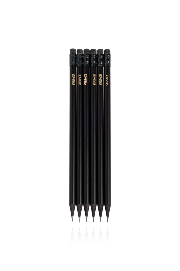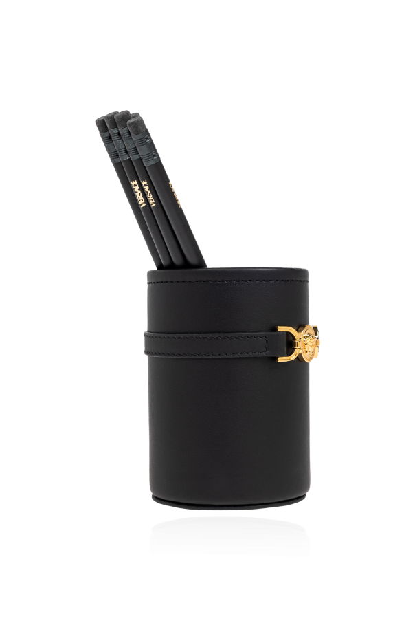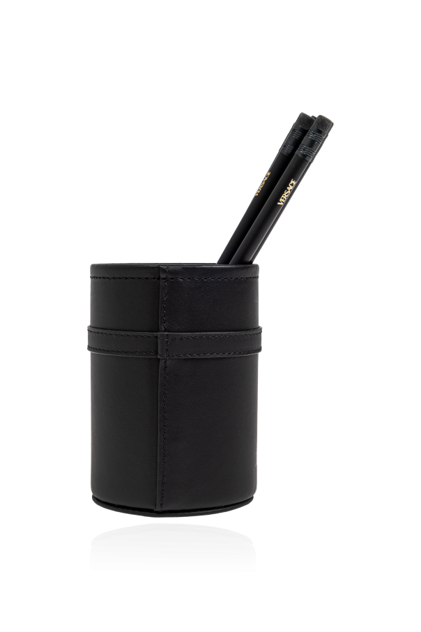 Presenting the Versace Home Set: Organizer and Six Pencils, a paradigm of luxury and sophistication. This exquisite collection is the epitome of elegant minimalism, seamlessly blending into any opulent interior or office environment. The Organizer is a masterpiece of craftsmanship, enveloped in dominantly black material with a cylindrical silhouette. It boasts a golden emblem on its front, a decorative element that could well be the designer\'s logo, exuding an aura of grandeur. Accompanying the organizer are six meticulously crafted black pencils, each adorned with a golden inscription, enhancing their luxurious appeal. The ensemble is crafted from a harmonious blend of leather, wood, and plastic, accentuated with golden details, underscoring the exclusivity of this unisex lifestyle accessory. Why Purchase This Product? Elegant and minimalistic design suitable for luxury interiors. Crafted by the world-renowned designer Versace Home. High-quality materials: leather, wood, and plastic. Exclusive black and gold accents.