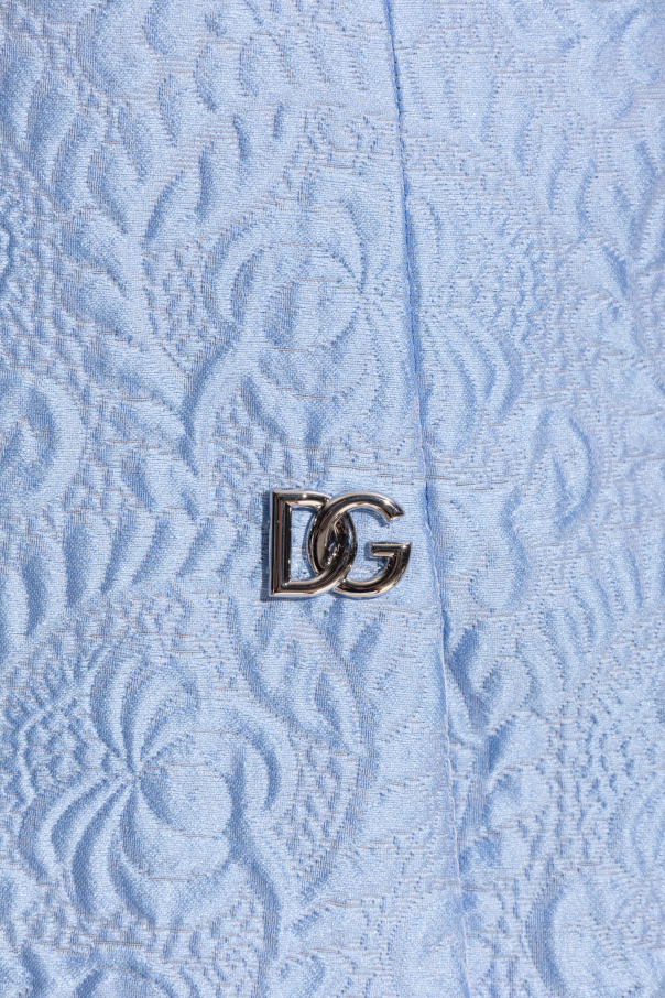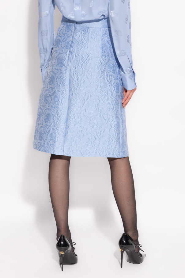 Discover the epitome of sophistication with our Dolce & Gabbana Logo Skirt, a masterful creation from the illustrious Italian designers Domenico Dolce and Stefano Gabbana. This exclusive piece, originating from their renowned collection, redefines elegance with its meticulous design and superior craftsmanship. The skirt boasts a dominant blue hue and an exquisite, textured floral pattern that exudes subtlety and grace. Crafted from a luxurious blend of cotton, polyester, and silk, the fabric offers a delicate sheen and superior quality. Featuring a midi length and a straight, slightly flared cut, this skirt accentuates your silhouette with its wide waistband. A signature metal logo, composed of the letters \"DG,\" adorns the front right side, signifying its luxurious heritage. The skirt is elegantly styled with a matching fitted blouse, also adorned with a delicate pattern and a miniature designer logo. Paired with sophisticated shoes and a chic handbag, this ensemble is perfect for both formal and modern settings. The back of the skirt is finished smoothly, adding a touch of classic refinement. With a discreet zip closure, this piece ensures a seamless and flattering fit. Why Choose This Product? Exquisite Design: Textured floral pattern and subtle logo detail. Luxurious Fabric: High-quality blend of cotton, polyester, and silk. Flattering Fit: Midi length with a wide waistband for a refined silhouette. Iconic Brand: A creation by the world-renowned Dolce & Gabbana. Versatile Style: Perfect for both formal and modern occasions.