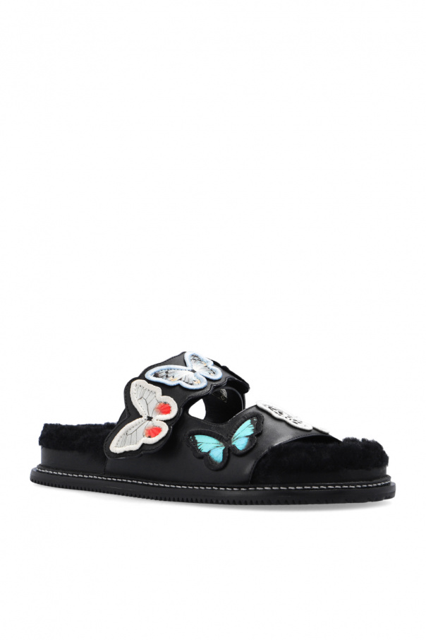 Black ‘Riva’ slides from Sophia Webster. Made of leather, this pair is complete with hook-and-loop fastening, the label’s signature multicolored butterfly appliqués and a black rubber sole.