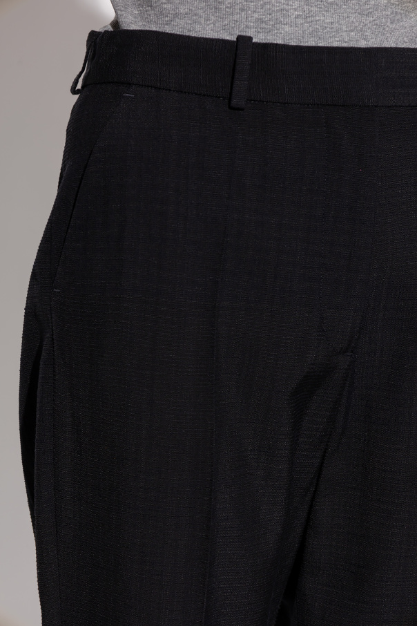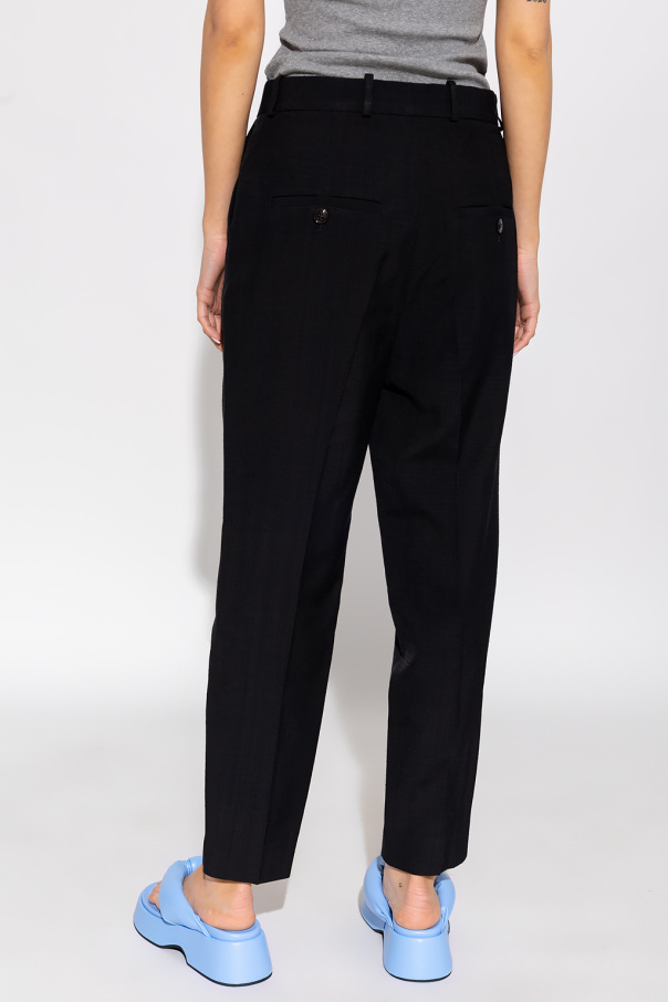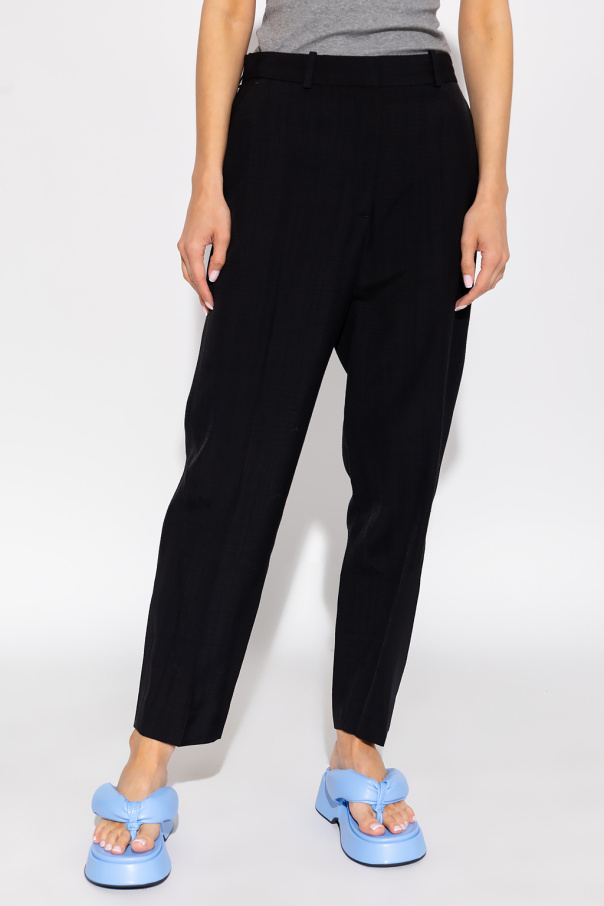 Black trousers from Toteme. Cut with a relaxed-fitting silhouette, this pair features a high-rise waist, a zip fly with a button and hook, two side seam pockets, two back button pockets and slightly tapered legs with pleats.