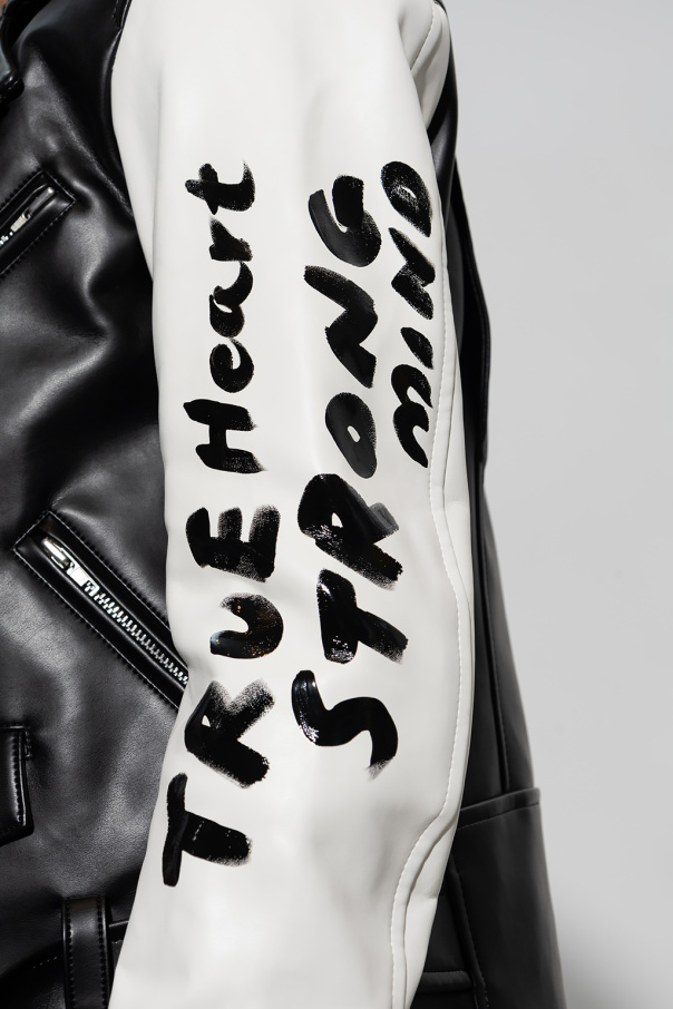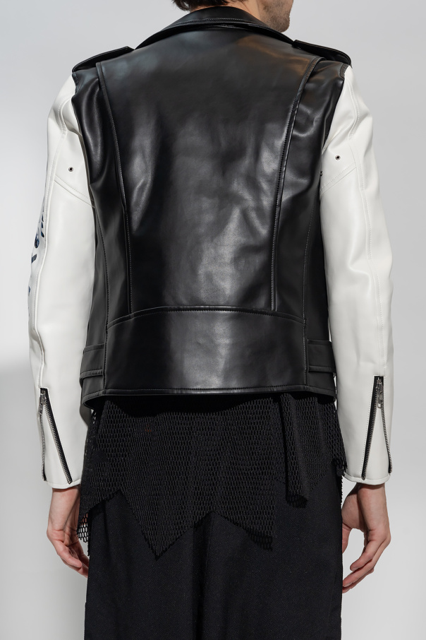 Black and white biker jacket from Comme des Garcons Black. Crafted from faux leather, this style fastens with a zipper and showcases a buckle tab at the waist, printed black lettering, snap fastenings on the flapped pocket and shoulder epaulettes, three zip pockets and long sleeves with zipped cuffs.