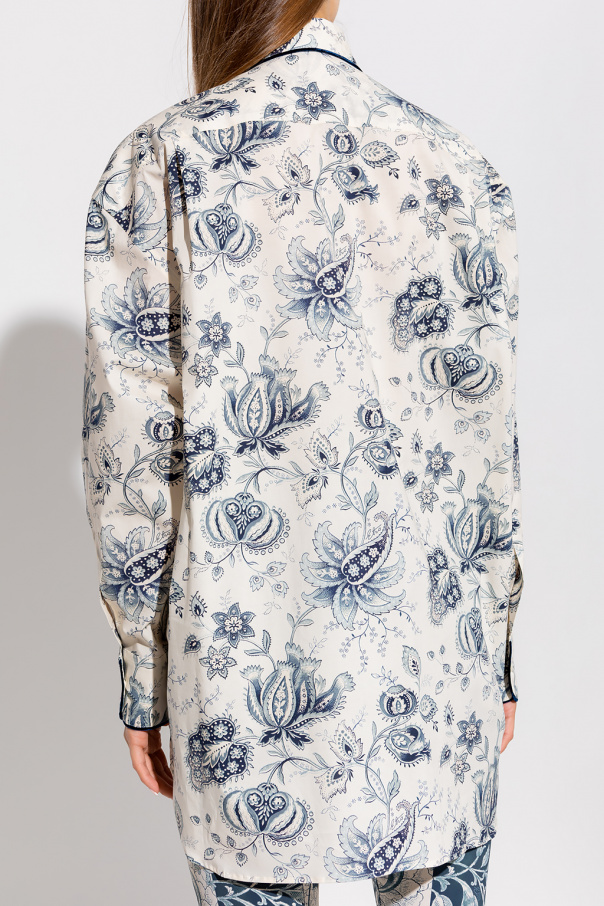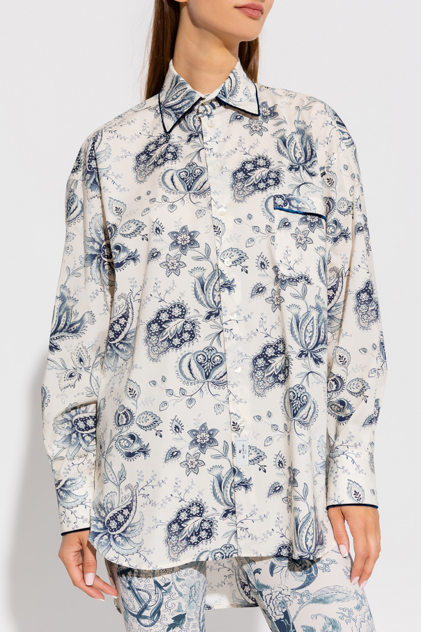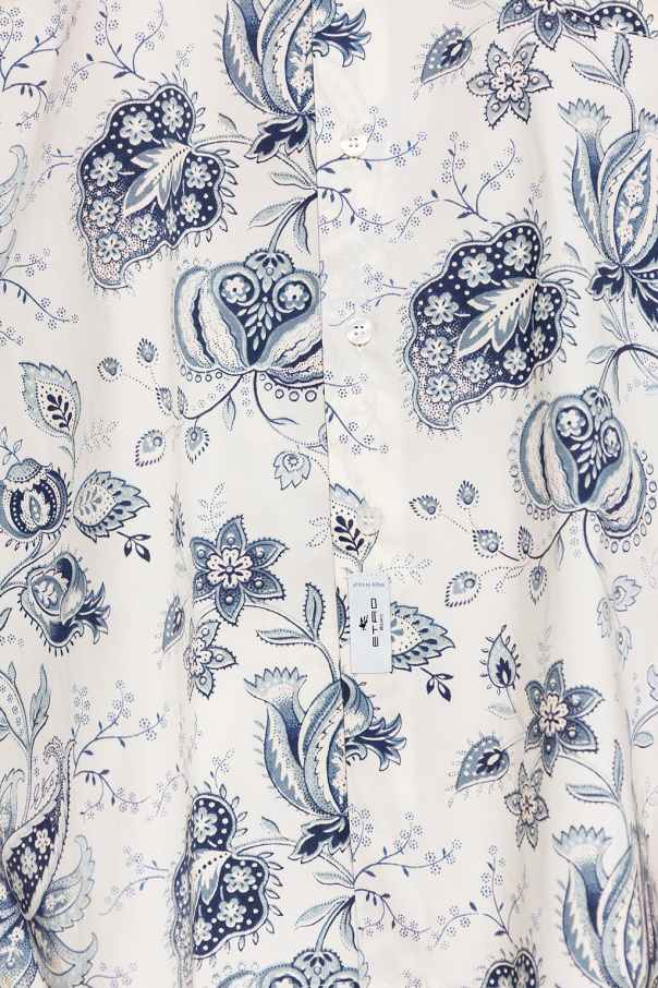Cream shirt from Etro. Crafted from cotton, this garment features button fastenings, front pocket, logo patch, navy and grey paisley and floral pattern, navy trimming with a velvet texture, longer back and long sleeves with button cuffs.