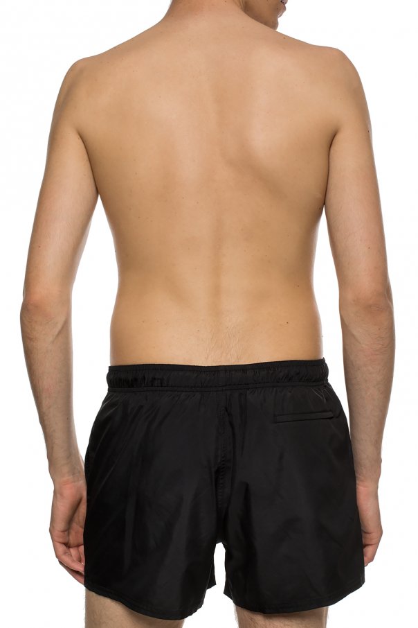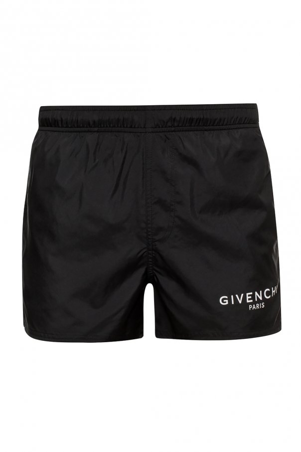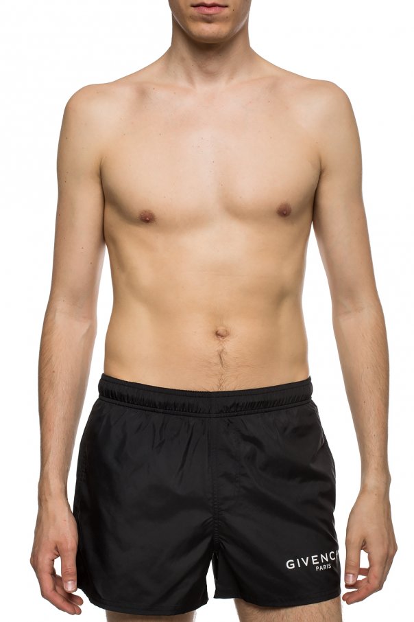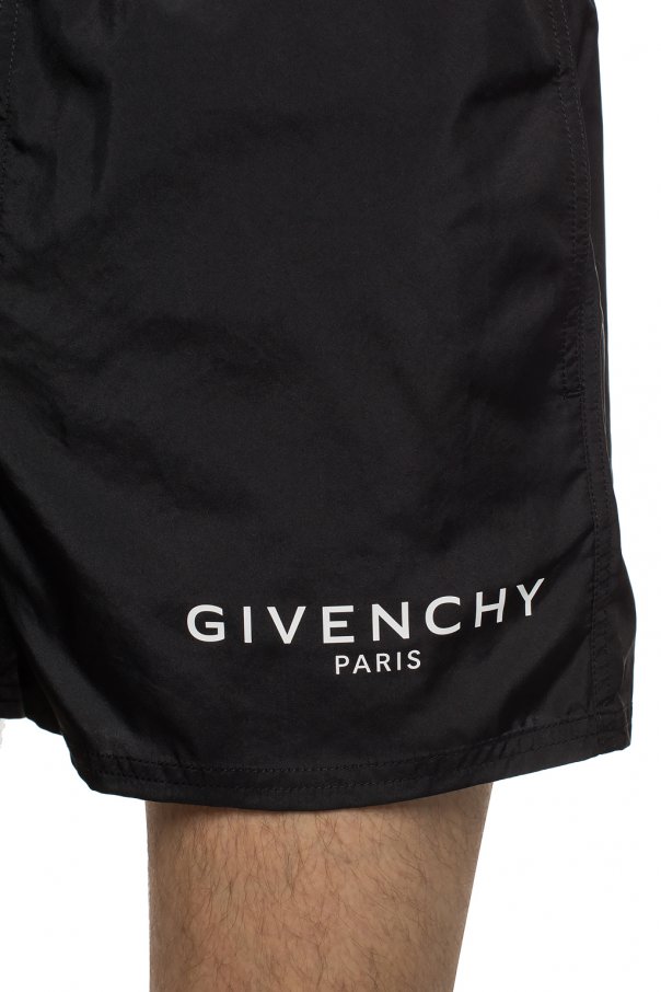 Black swim shorts from Givenchy. Printed with the brand's logo in white, this pair features a drawcord-adjustable waist, two side seam pockets and one back zipped pocket.