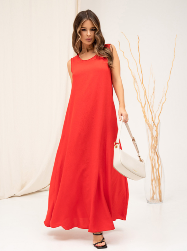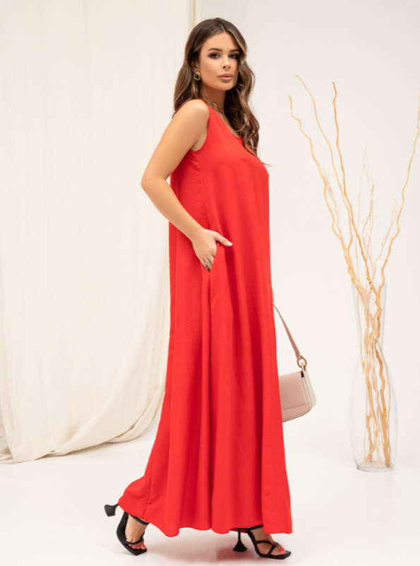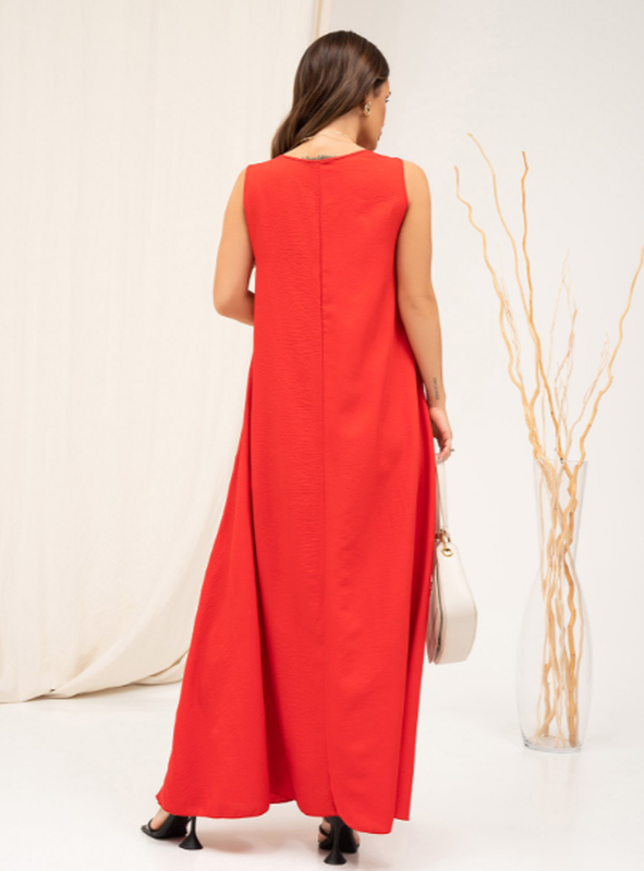 Довгий сарафан із червоної бавовни з бічними кишенями. Сарафан обладнаний напівкруглою проймою горловини. Модель без рукавів із розкльошеним вільним кроєм трапеції й максі довжиною.