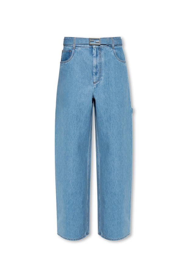 Blue jeans from Fendi. Fastened with a zip and button, this high-waisted pair features a removable belt with a silver-tone logo buckle, three front pockets, two back pockets and wide, straight legs.