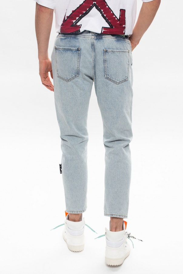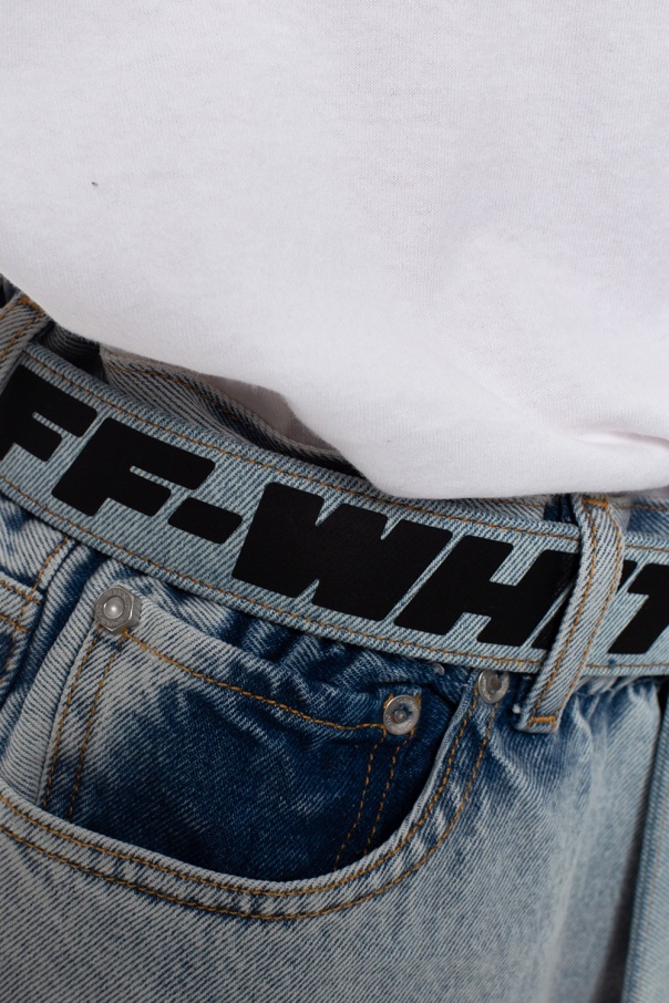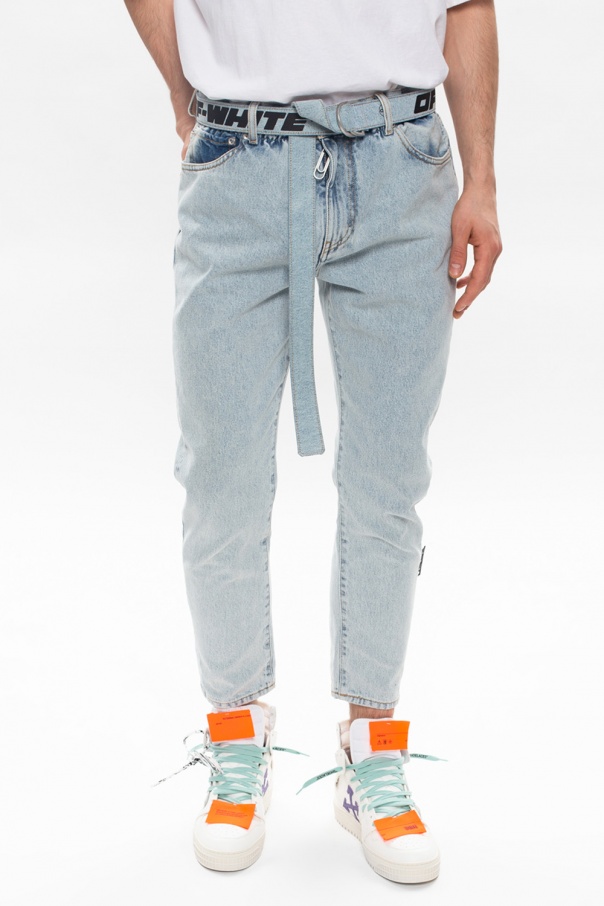 Blue jeans from Off-White. Fastened with a zip and buttons, this design features four slip pockets and a removable belt printed with a black logo.