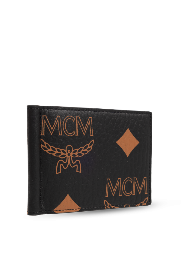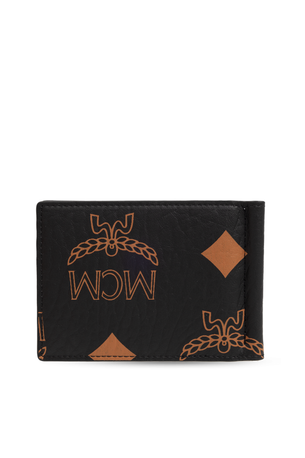 Black wallet from MCM. Made of canvas and decorated with a brown ‘Visetos’ pattern, this item features a leather-clad interior with a note clip and six card slots. Silver-tone metal hardware completes the design.
